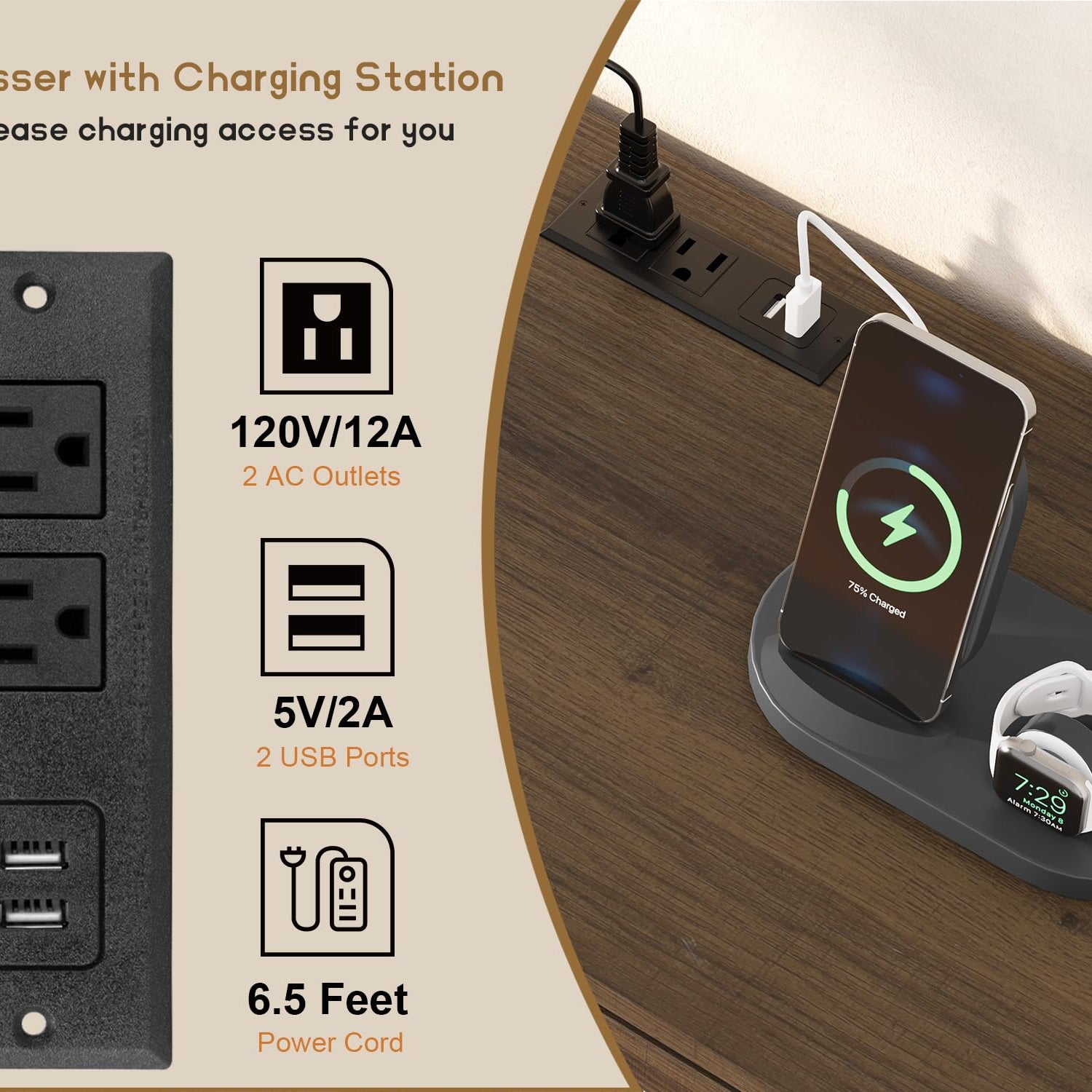- 【Built-In Charging Station】:Equipped with 2 AC outlets and 2 USB ports, this dresser allows you to conveniently charge laptops, phones, lamps, and other small appliances simultaneously without the need for extra adapters.