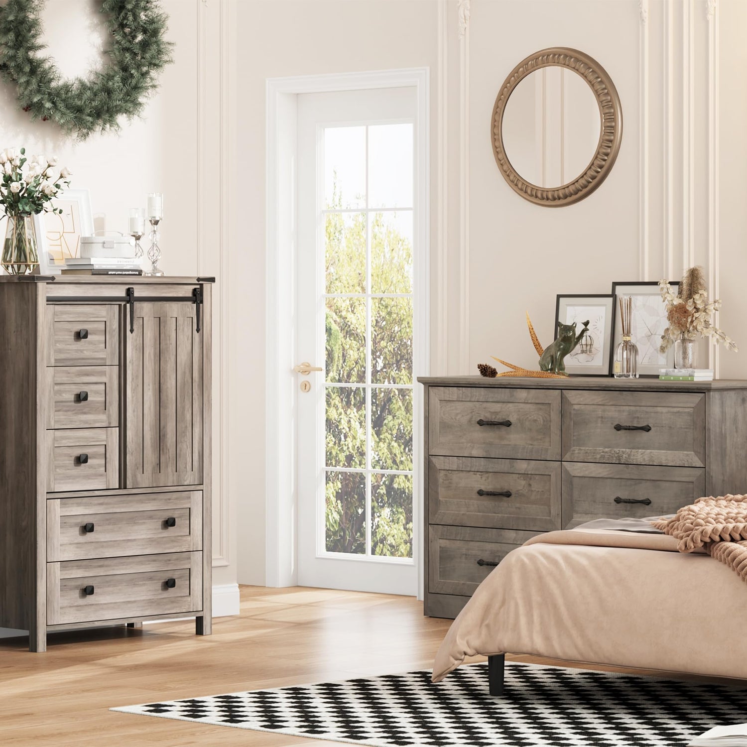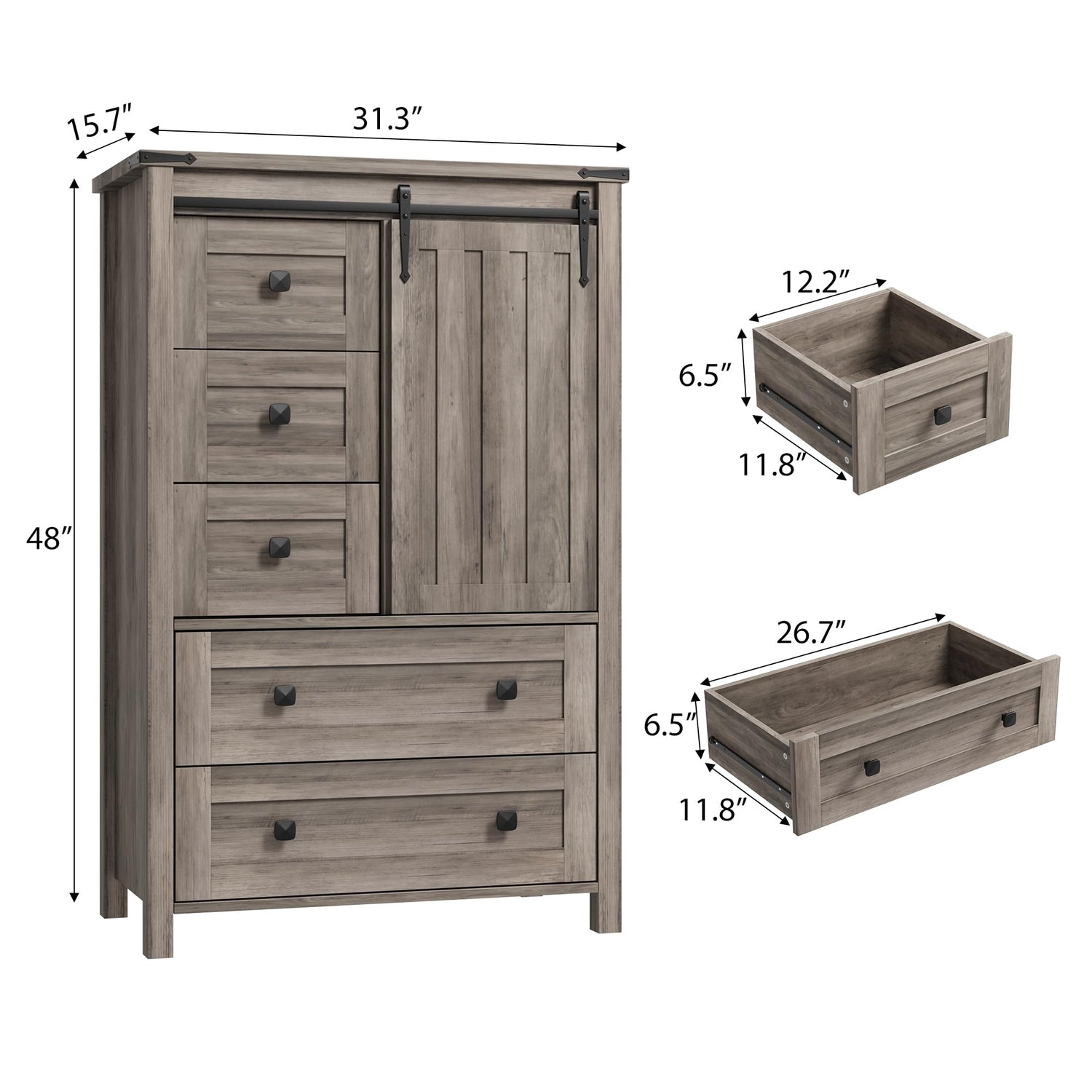 - 【SPACE-SAVING FARMHOUSE DESIGN】Overall size: 15.7 in D x 31.3 in W x 48 in H. Top 3 drawers: 11.8 in D x 12.2 in W x 6.5 in H. Bottom 2 drawers: 11.8 in D x 26.7 in W x 6.5 in H. Featuring dual-sized drawers and sliding barn doors, this 5 drawers dresser offers flexible storage for clothes, linens, and daily items—perfect for keeping your space neat and clutter-free.