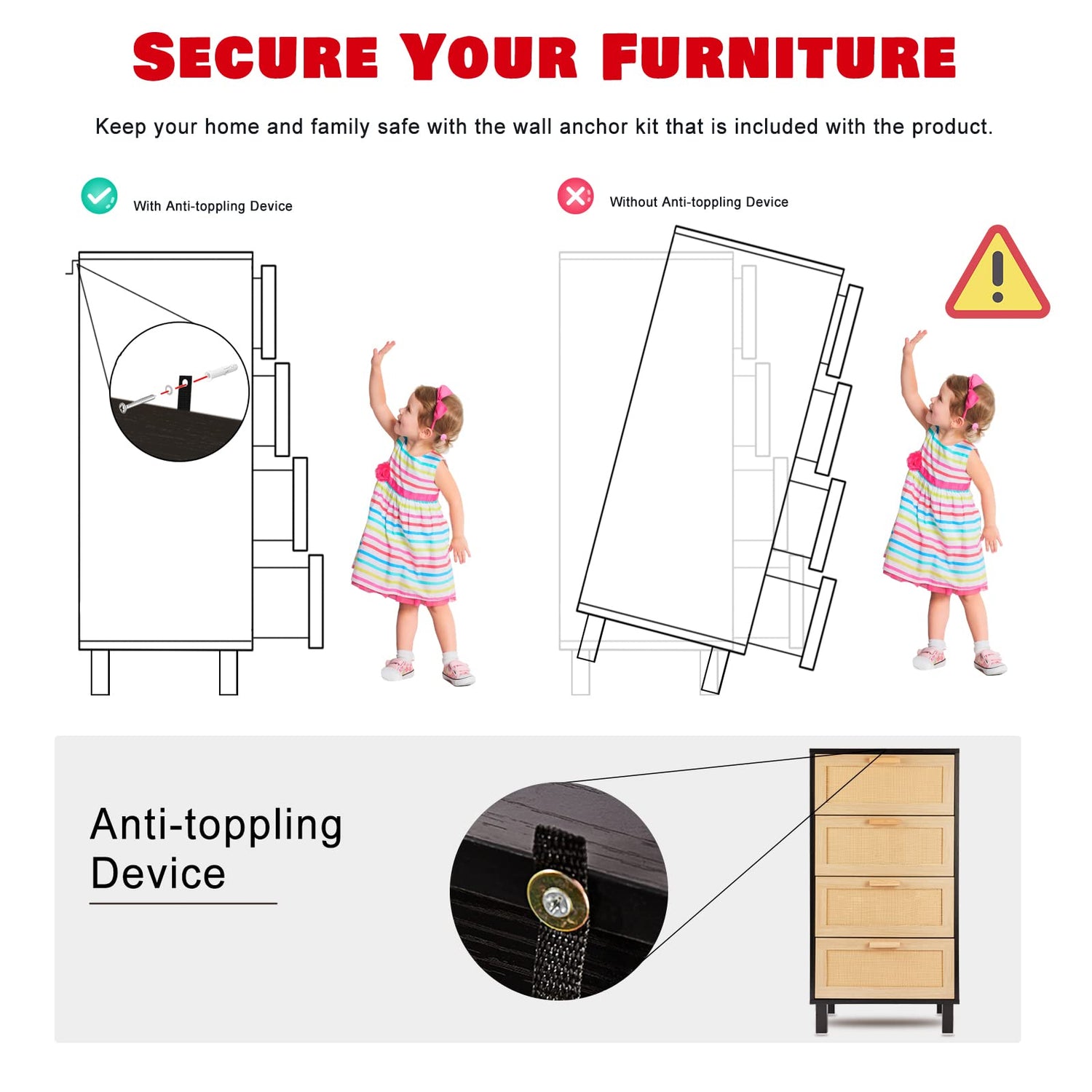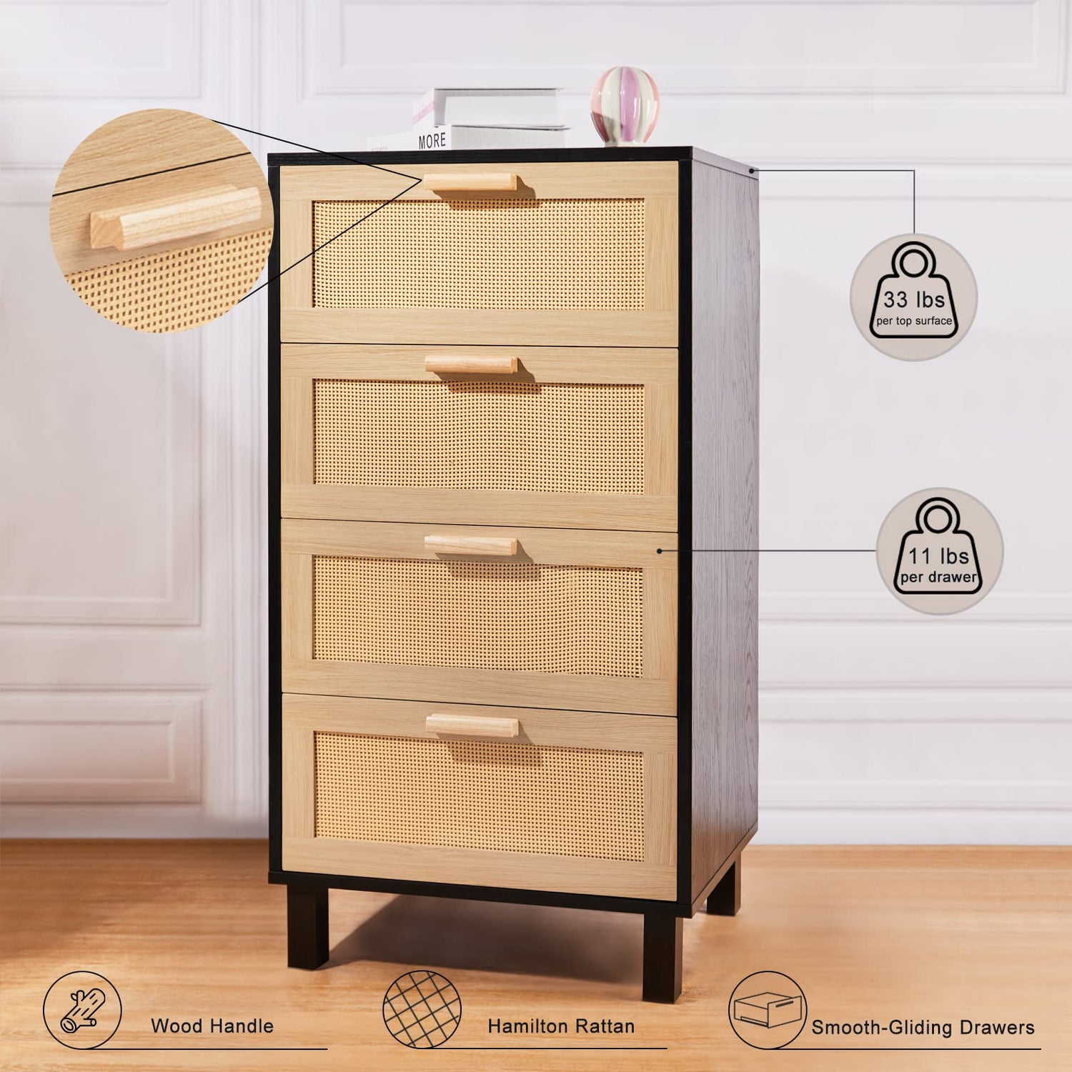 Graficial 4 Drawer Dresser, Dresser for Bedroom, Rattan Chest of Drawers, Tall Bedside Storage Dresser for Bedroom,Living Room, Black/Oak