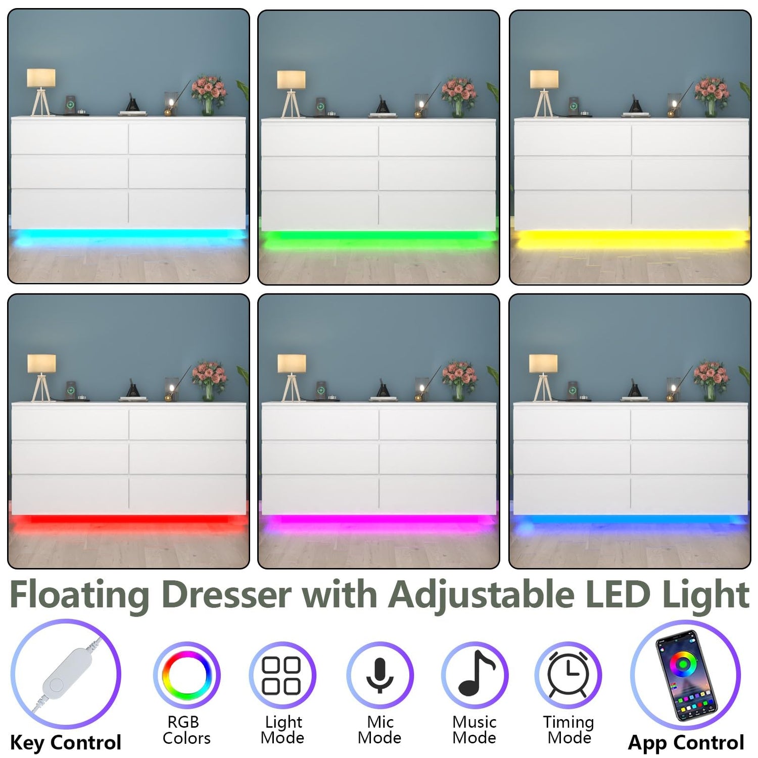- [Dresser with Surrounded LED Lights] Elevate your room's aesthetic with our white dresser, featuring an integrated LED strip lighting.You have the flexibility to customize the lighting according to your mood and preference.Whether you prefer a soft and soothing glow or a vibrant and colorful display. The subtle LED lighting also provides soft illumination that's perfect for late-night or early morning use.