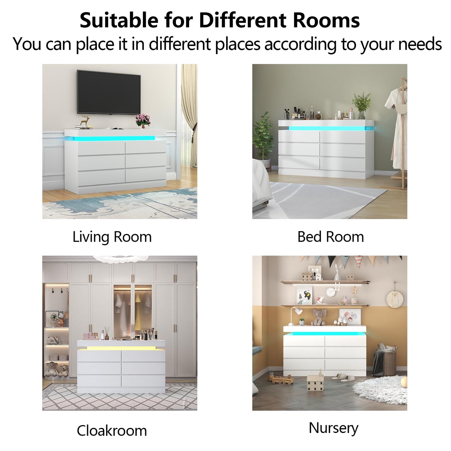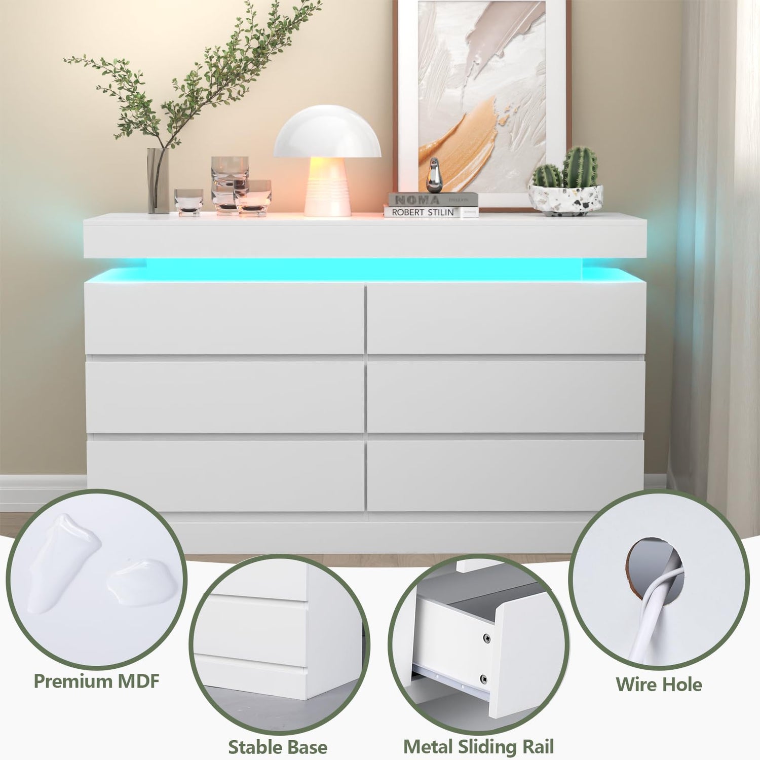 Gyfimoie 6 Drawer Dresser with Power Outlet, White Dresser with LED Light, Modern Chest of Drawers for Closet, Double Wide Drawer Organizer Cabinet for Bedroom, Living Room, Entryway, Hallway (White)