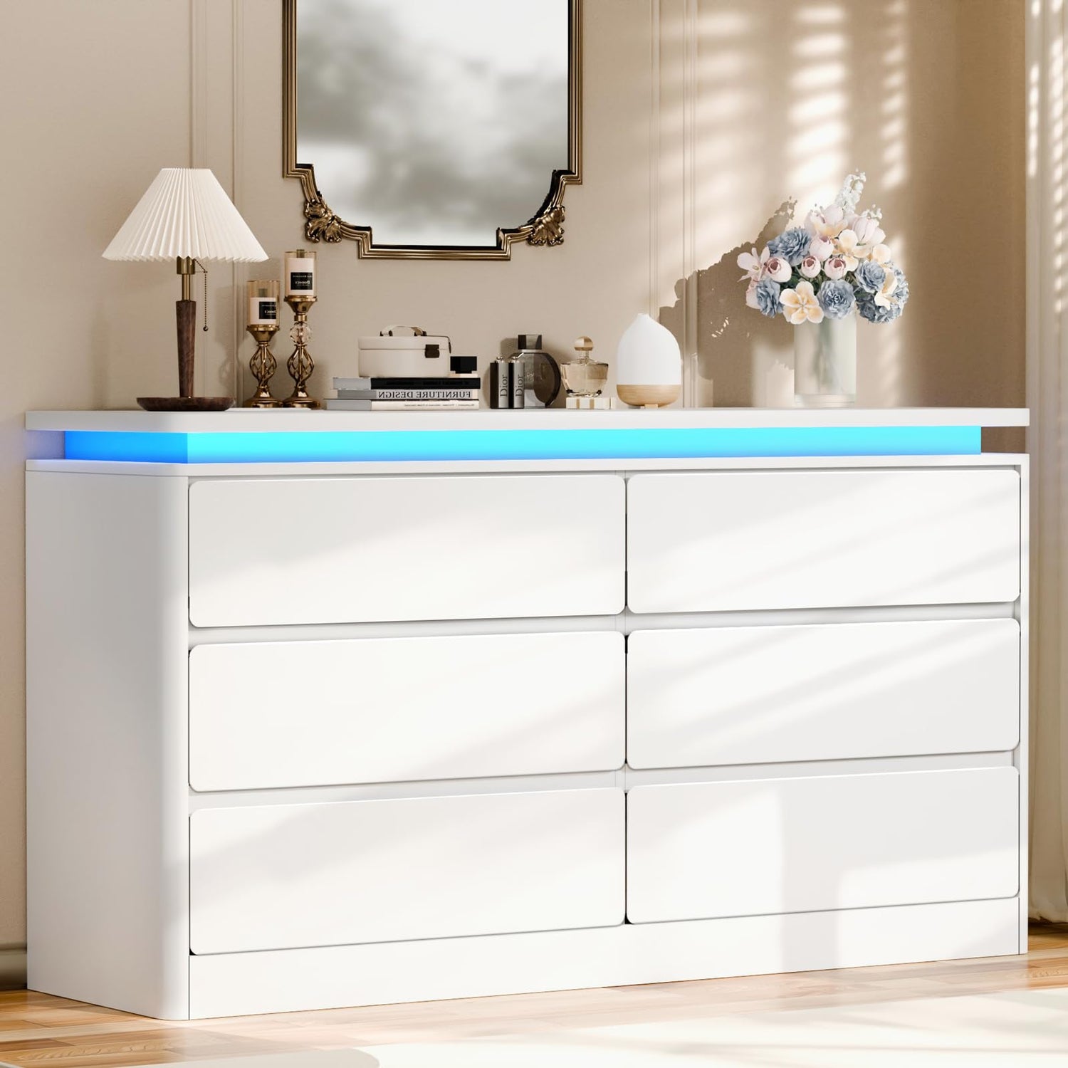 Gyfimoie 6 Drawer White Dresser for Bedroom, 47.2" Long Chest of Drawers with Charging Station & LED Lights, Double Wooden Storage Cabinet Dresser for Closet,Modern TV Stand with Deep Drawers