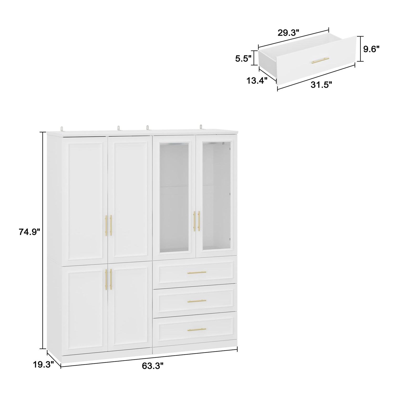 Hitow Wardrobe Armoire Closet with Glass Doors, 63.3" W Wardrobe Storage Cabinet with 3 Drawers & Hanging Rod, Wardrobe Armoire Dresser for Bedroom Clothing Organizer, White