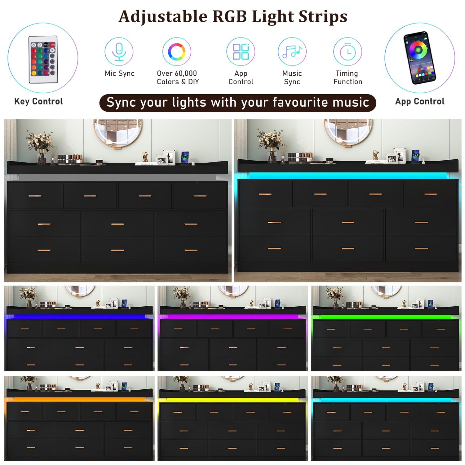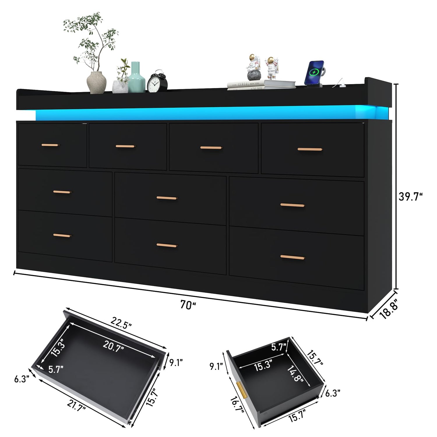 Hlivelood 10 Drawer Dresser with LED Light and Charging Station, Modern Chest of Drawers for Closet, Wide Drawer Organizer Cabinet, Living Room, Entryway, Hallway, Black