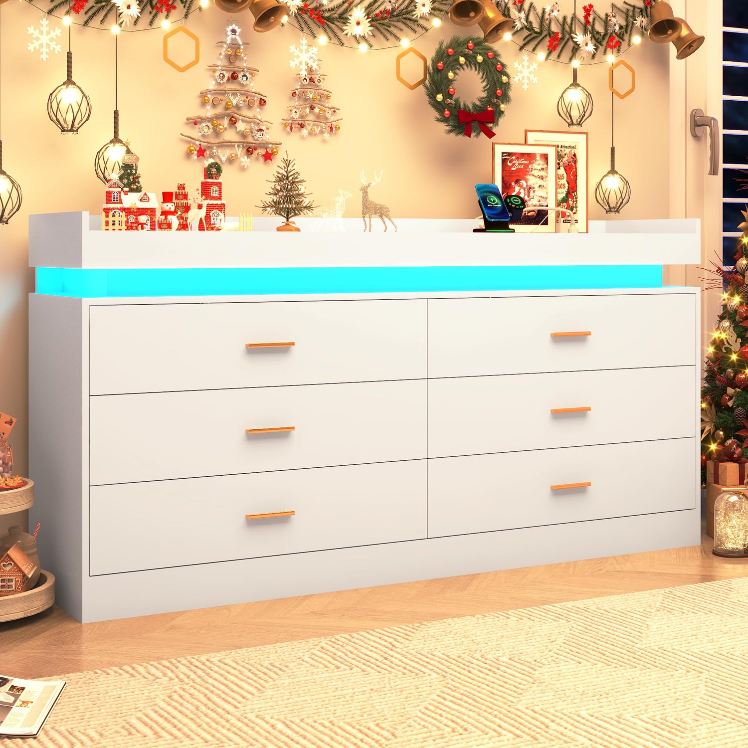 Hlivelood 6 Drawer Dresser with LED Light and Charging Station, 59" Modern Chest of Drawers for Closet, Wide Drawer Organizer Cabinet for Bedroom, Living Room, Entryway, Hallway, White