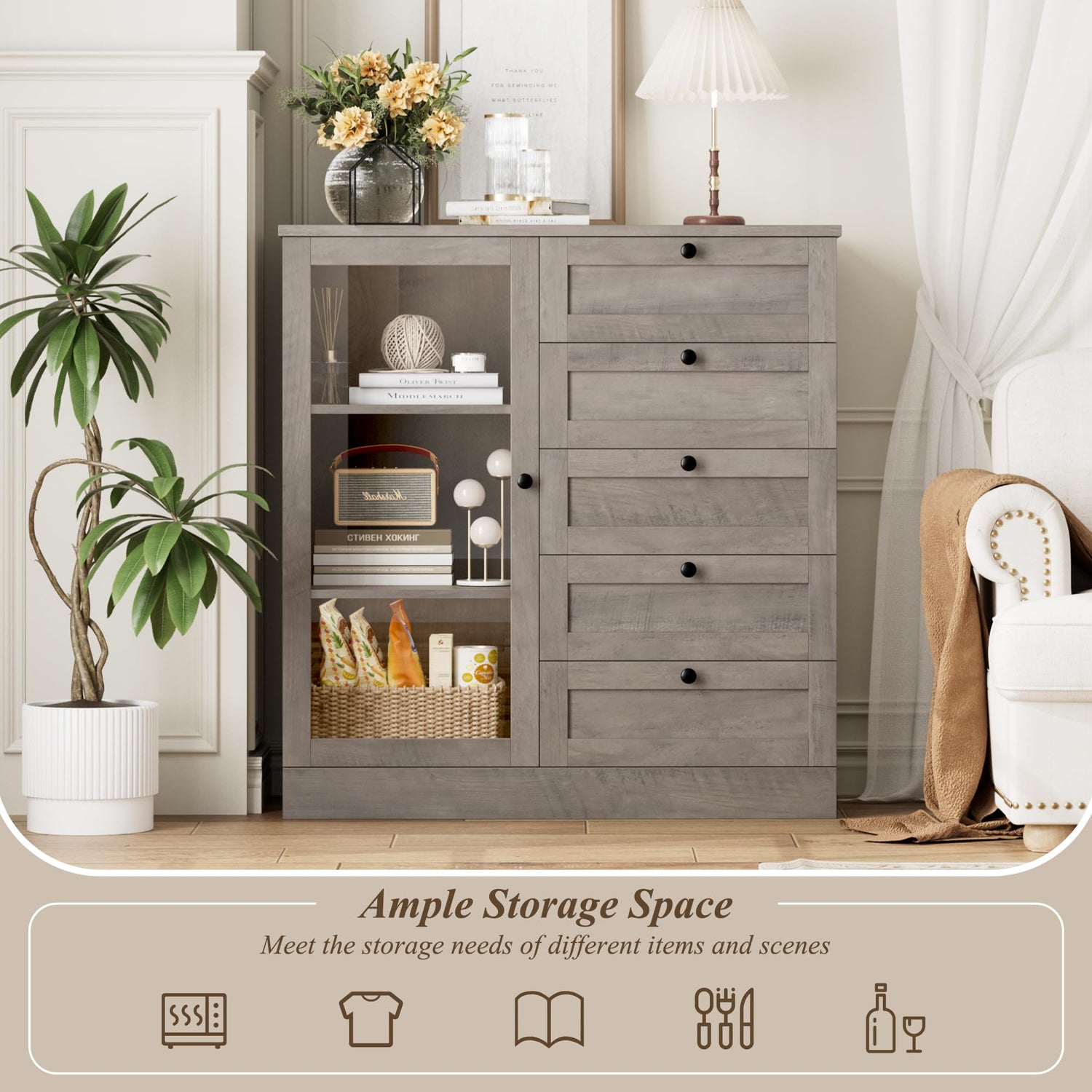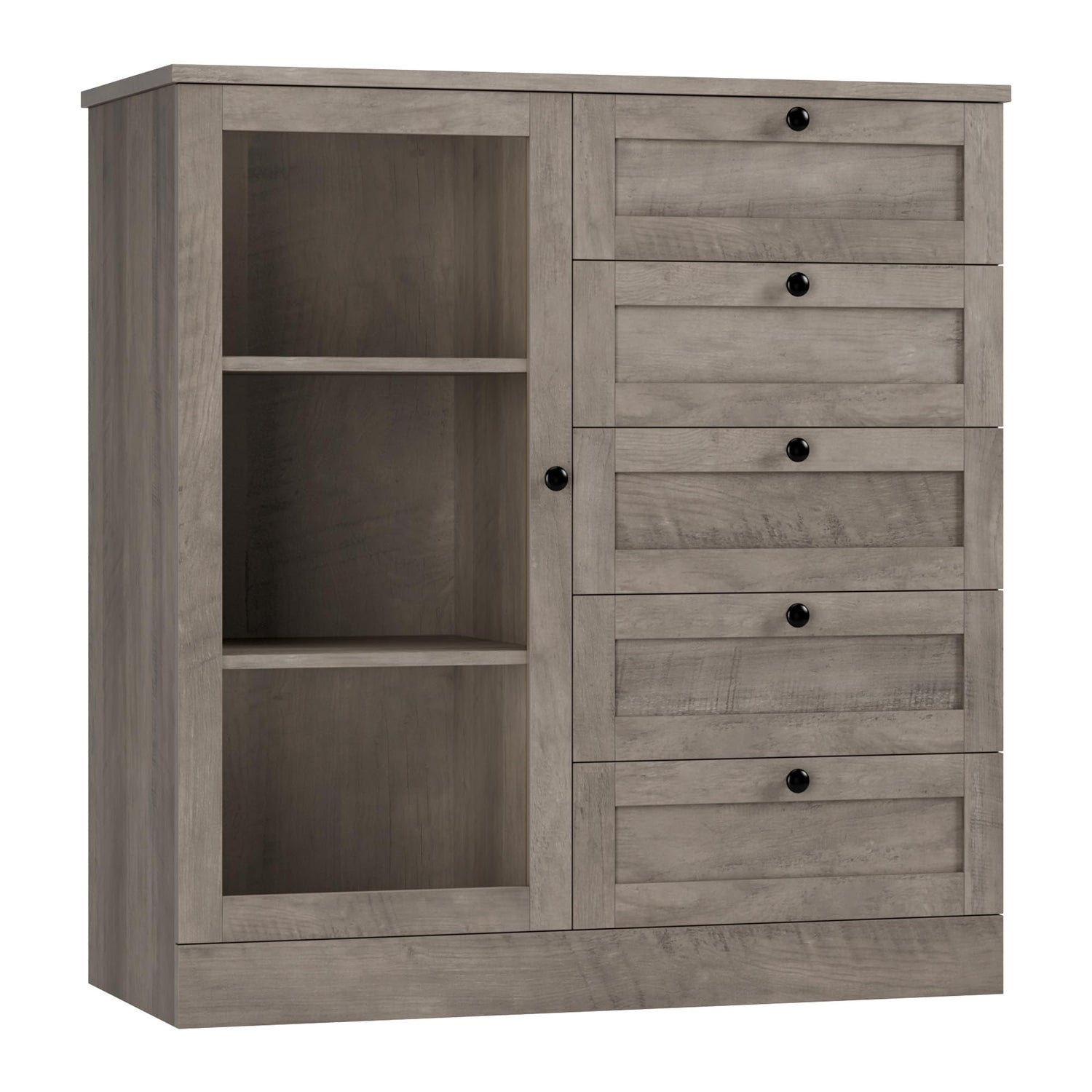 HOSTACK 5 Drawer Dresser with Door, Storage Cabinet with Drawers and Shelves, Wide Wood Dresser, Modern Chest of Drawers Organizers for Living Room, Kitchen, Hallway