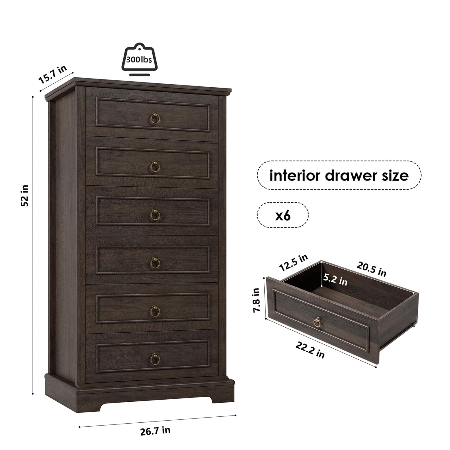 HOSTACK 6 Drawer Dresser, 52" Tall Chest of Drawers, Modern Farmhouse Storage Dressers Organizer for Living Room, Hallway, Entryway, Home Office, Dark Brown