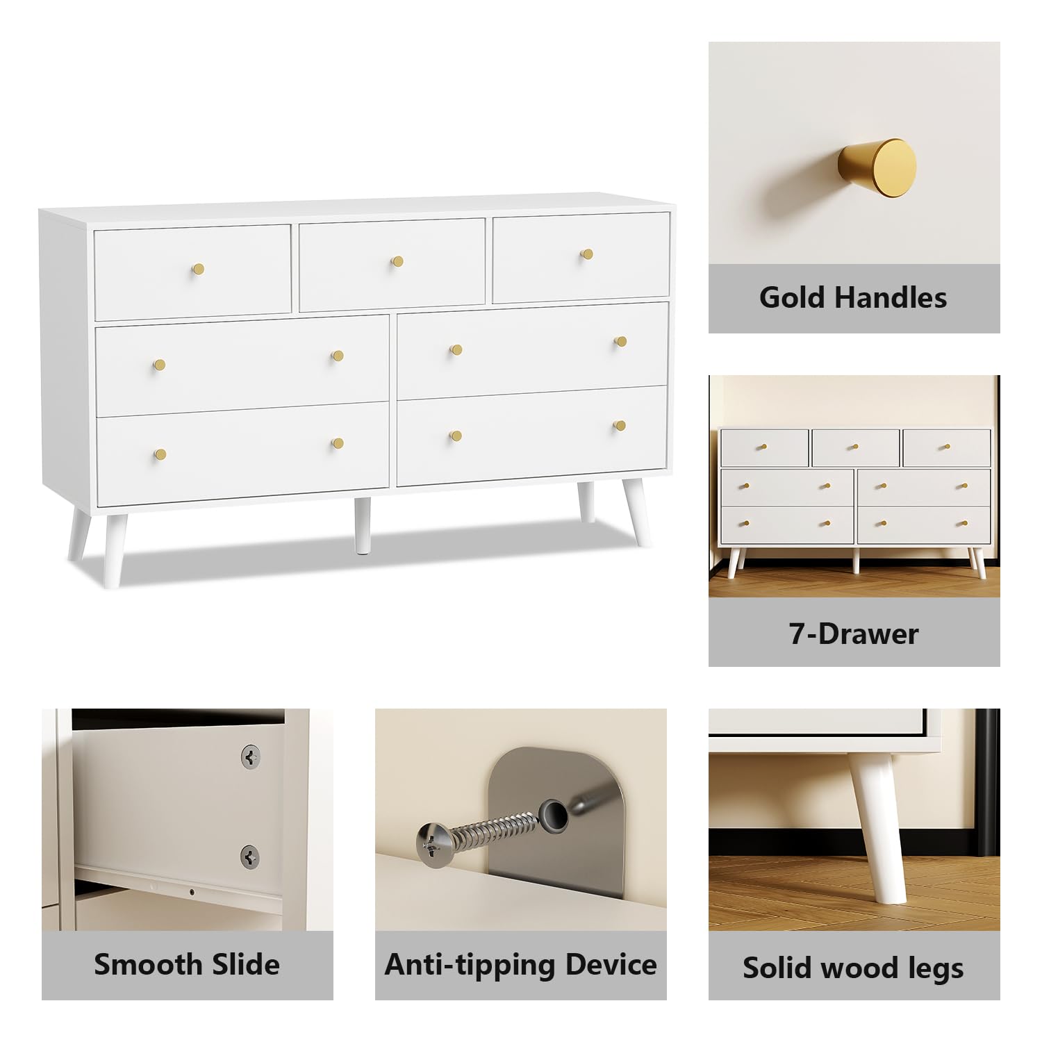 - 【Large Capacity】Featuring 4 large drawers and 3 medium drawers, this white dresser provides ample storage space for your clothes, cosmetics, photo albums, or any other personal items. The tabletop is perfect for vases, photos, mirrors, and frequently used items.