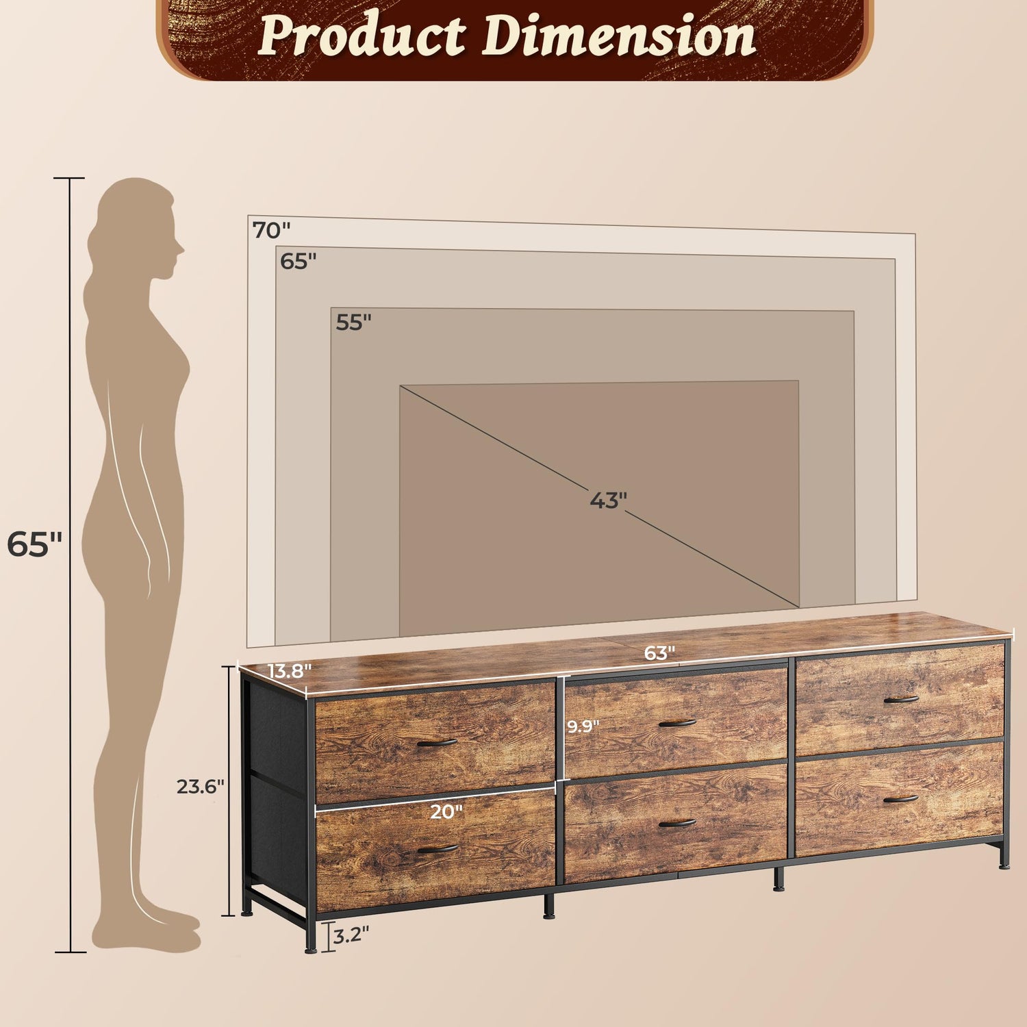 - 【6-Drawer Storage Dresser】Declutter your home life with this spacious 63 inch TV stand with storage featuring 6 deep fabric drawers. Perfect for organizing everything from clothes and bedding to gaming gear and media collections, making your space more functional and serene. Huuger