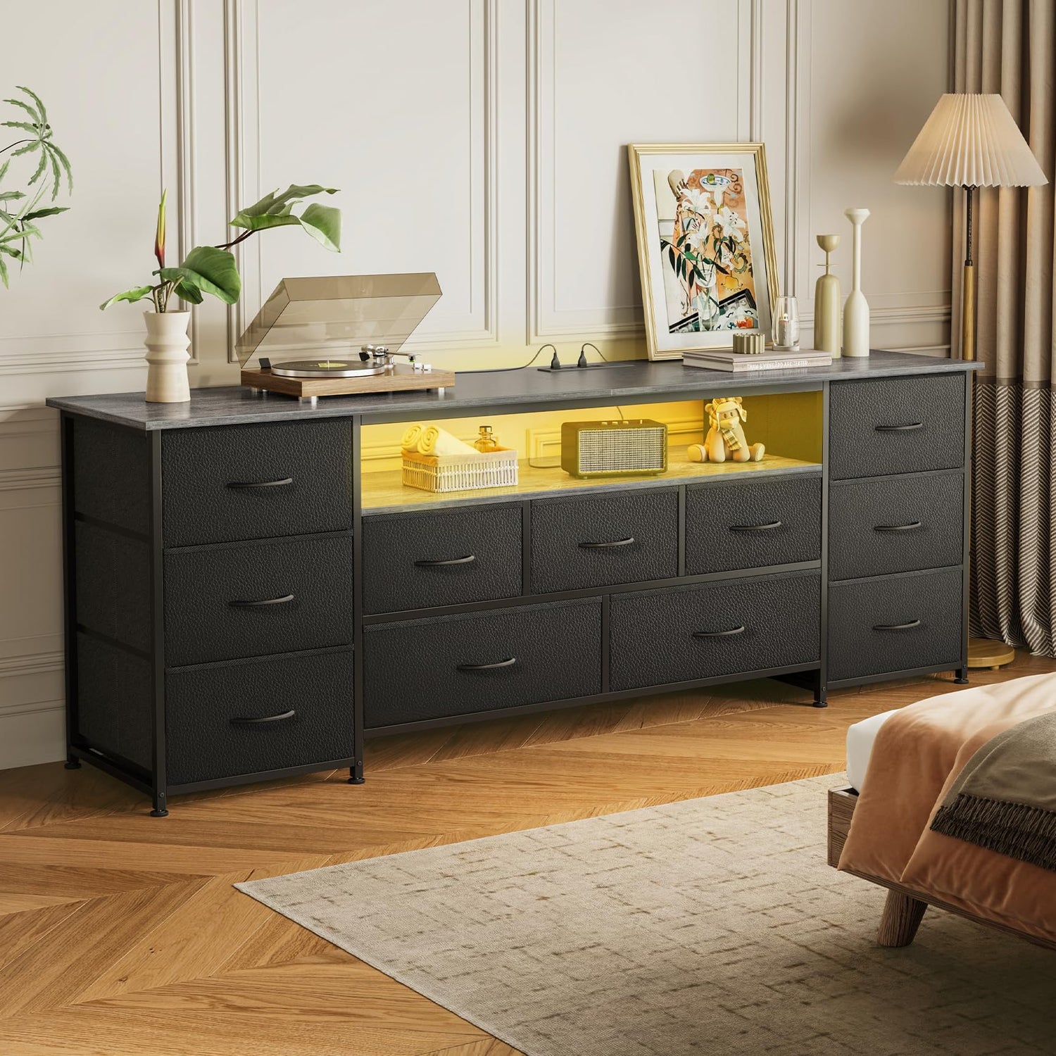 Huuger 63 Inch TV Stand for 65, 70 Inch TV, 11 Drawer Long Dresser with Power Outlets and LED Lights, Entertainment Center with Storage, Grey Dresser with PU Leather Surface