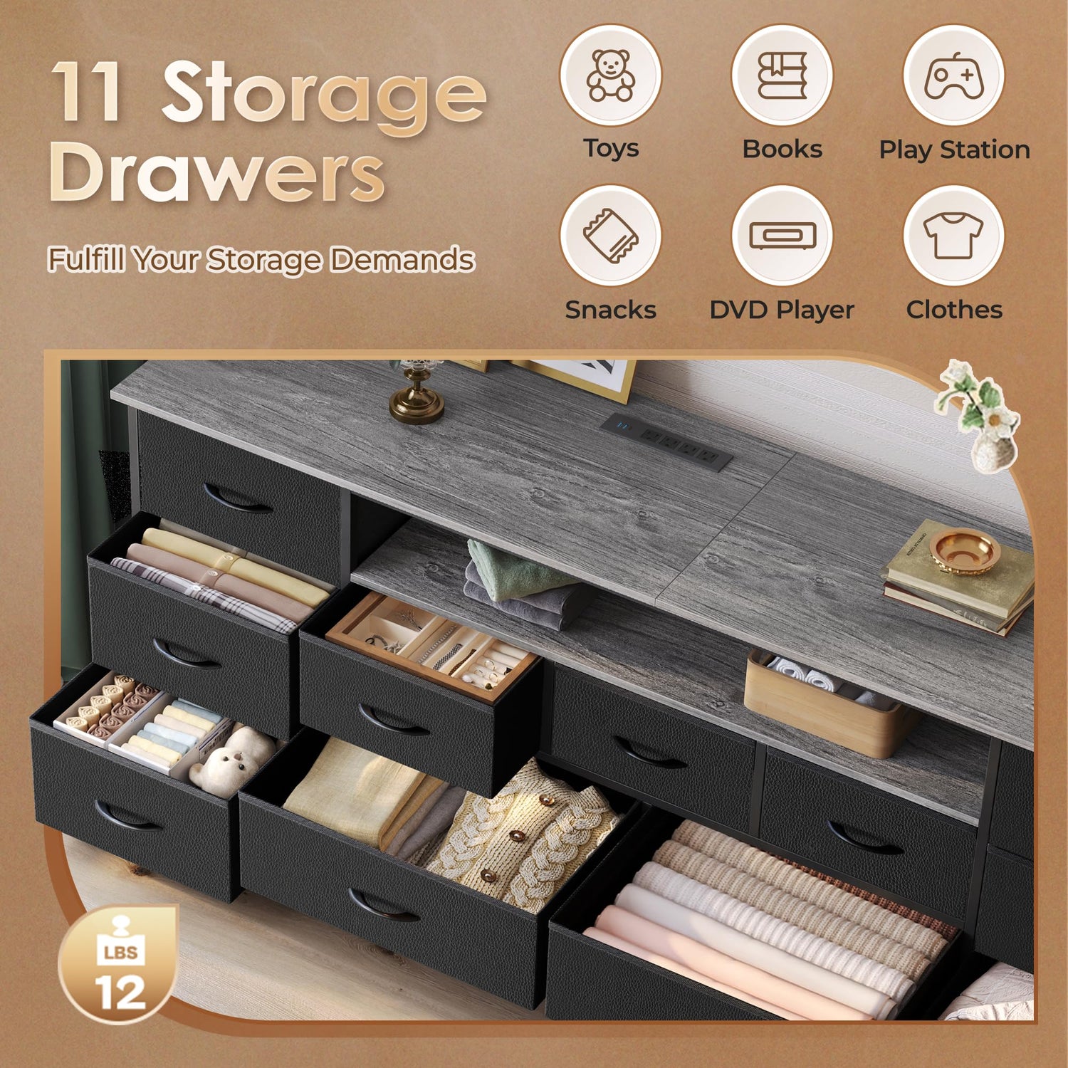 - 【11 Drawer Dresser with Stunning Storage】Featuring 11 drawers in 3 sizes, this TV stand with drawers has a stunning storage, allowing you to neatly organize and store your media devices, DVDs, gaming consoles, books, other accessories. The drawers are great for additional, out of sight storage. You can also use it to accommadte various clothing