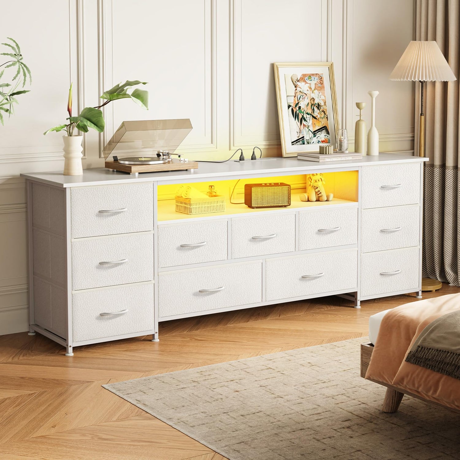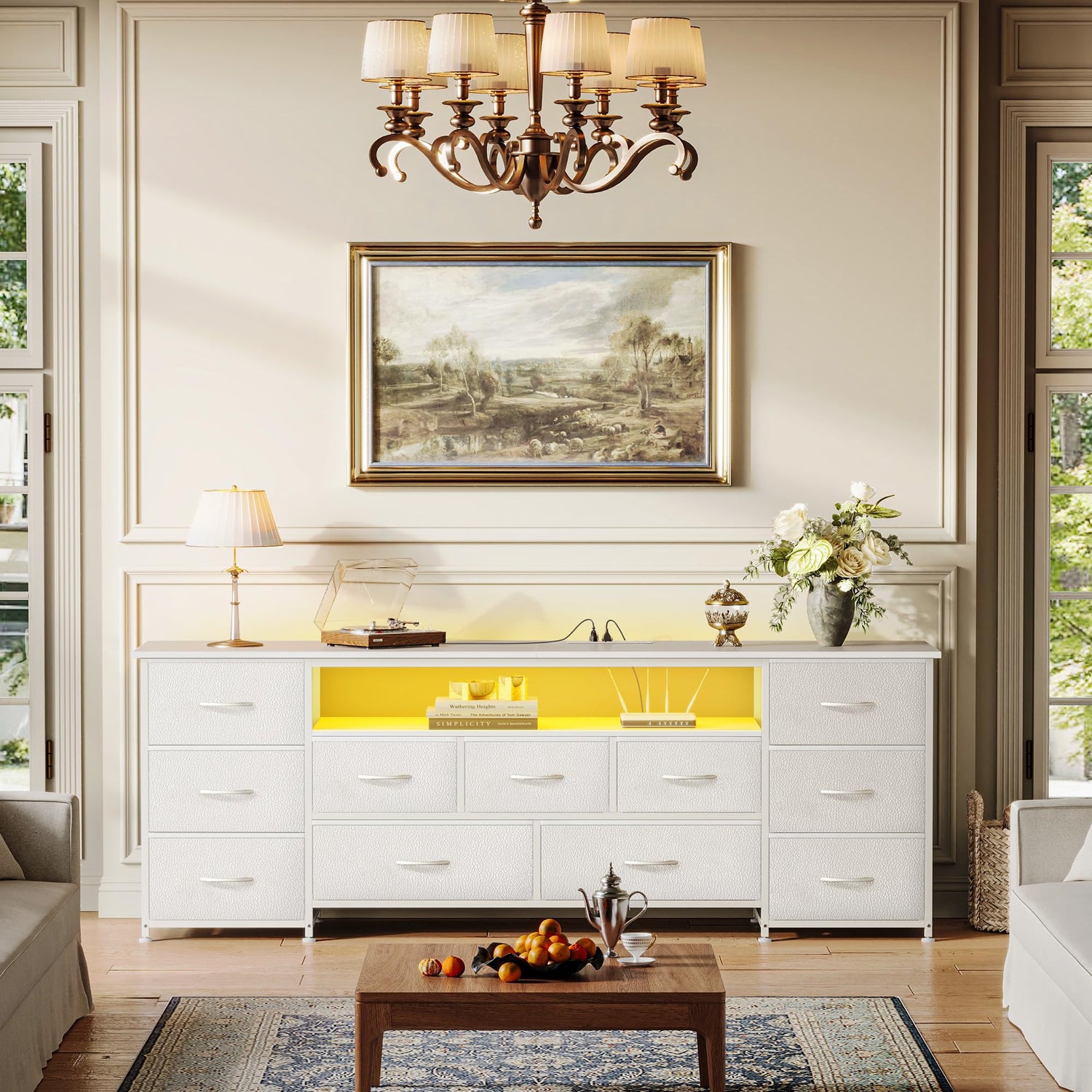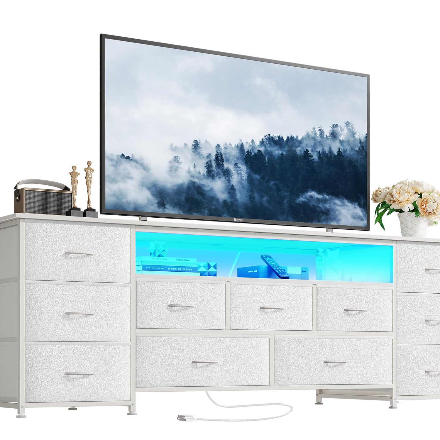 Huuger 63 Inch TV Stand for 65, 70 Inch TV, 11 Drawer Long Dresser with Power Outlets and LED Lights, Entertainment Center with Storage, White Dresser with PU Leather Surface
