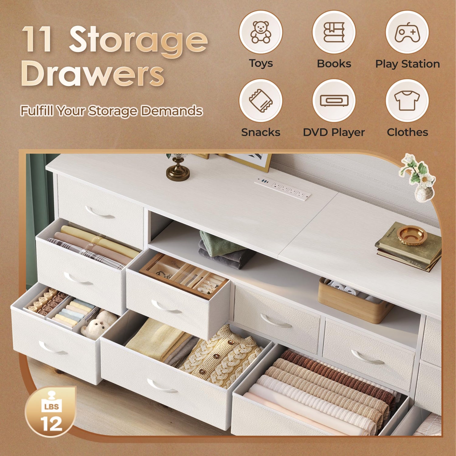 - 【11 Drawer Dresser with Stunning Storage】Featuring 11 drawers in 3 sizes, this TV stand with drawers has a stunning storage, allowing you to neatly organize and store your media devices, DVDs, gaming consoles, books, other accessories. The drawers are great for additional, out of sight storage. You can also use it to accommadte various clothing