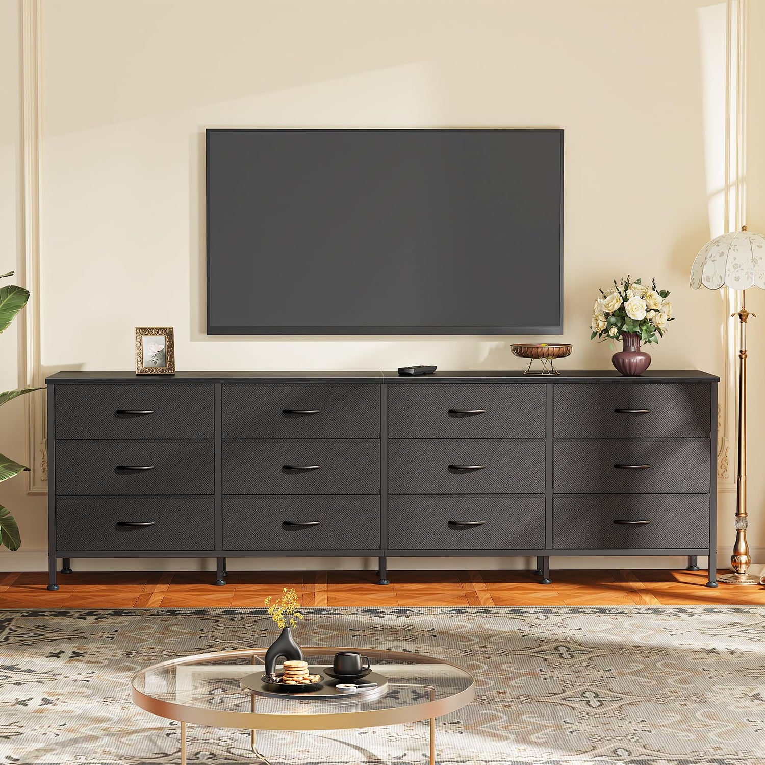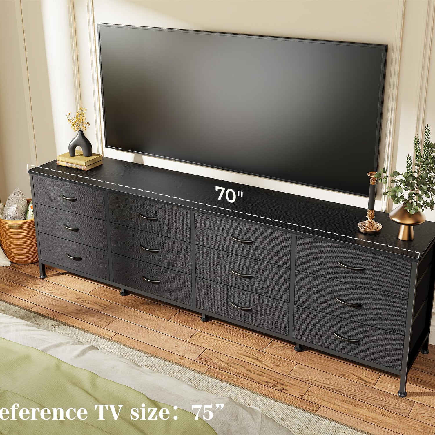 Huuger 70 Inch Black Dresser for Bedroom, TV Stand for 65, 75, 80 Inch TV, 12 Fabric Drawer Long Dresser, Wide Chest of Drawer, Storage Units for Living Room
