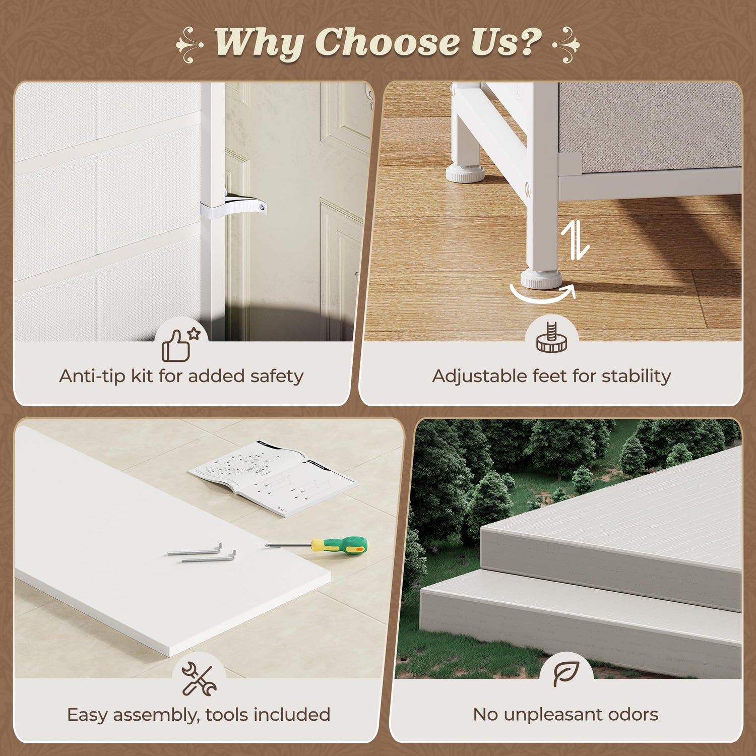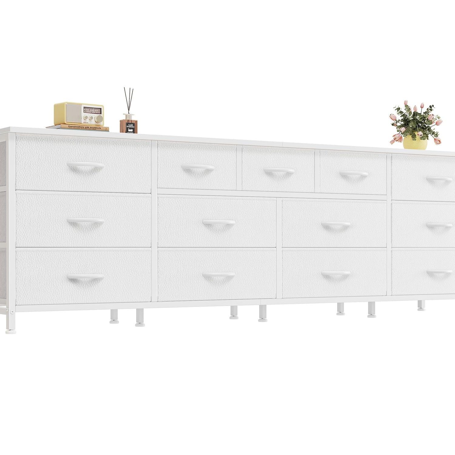 - 【Sturdy and Stable Design】Built with a durable wooden top, high-quality fabric drawers, and a sturdy metal frame, this long dresser is designed to last. The anti-tip kit ensures safety for families. Plus, 8 adjustable feet keep it stable on uneven floors and protect your surfaces from scratches