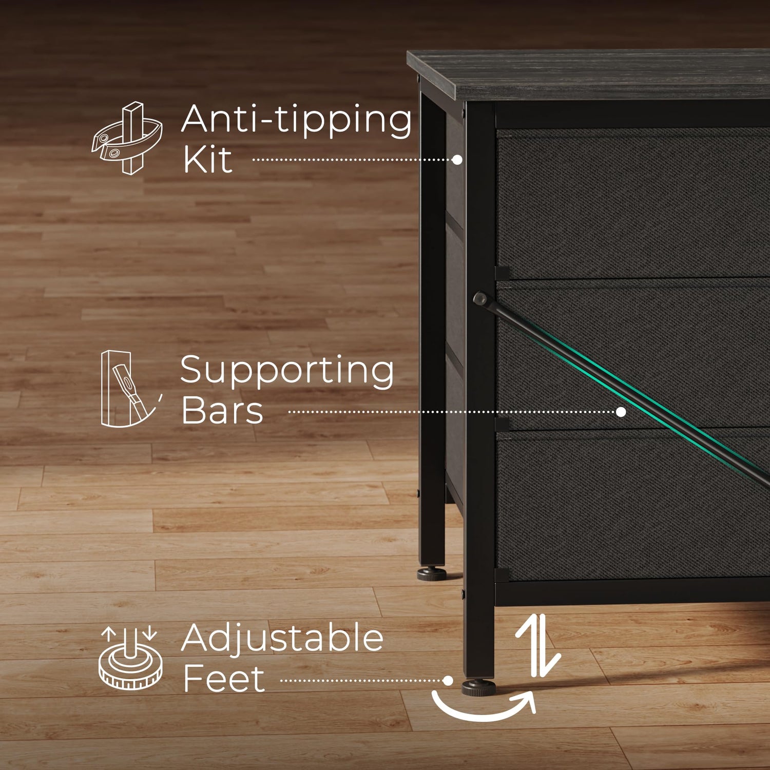 - 【Sturdy, Safe and Stable】Crafted from high-quality fabric, a durable wooden top, a robust metal frame and easy-to-pull handles, this dresser TV stand brings longevity while being lightweight to move. Drawers glide smoothly for easy access even to little kids. With anti-tip kits included, it's child-friendly and ensures this clothes dresser stays securely in place. The 5 adjustable feet keep it stable on uneven surfaces and safeguard your floors from scratches