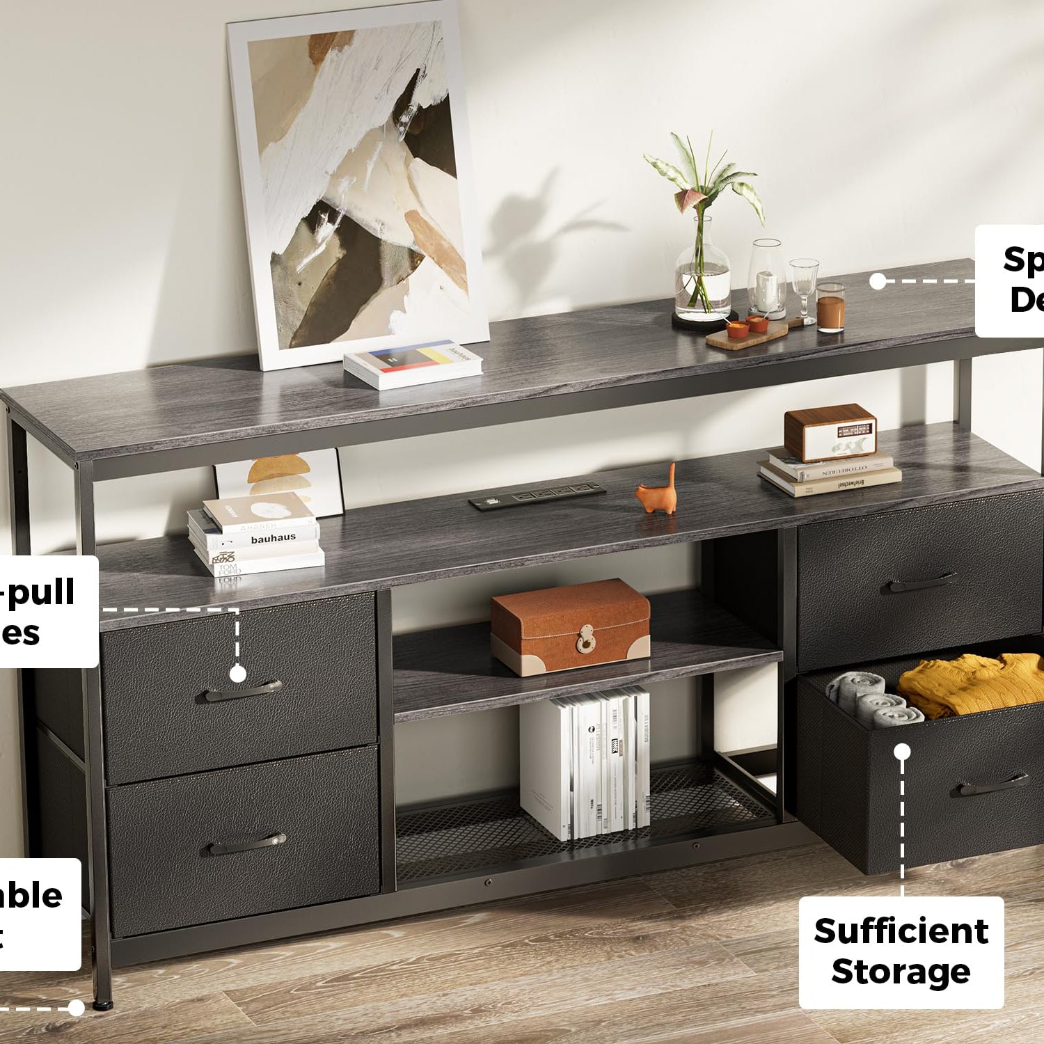 - 【SUPPORT TV & AMPLE STORAGE】Support and style go hand in hand with our robust TV stand. Ideal for TVs up to 65 inches, it features 4 sleek fabric drawers and a large tabletop for all your storage needs. Adjustable shelving offers flexibility for items big or small—be it your sound system or your favorite games