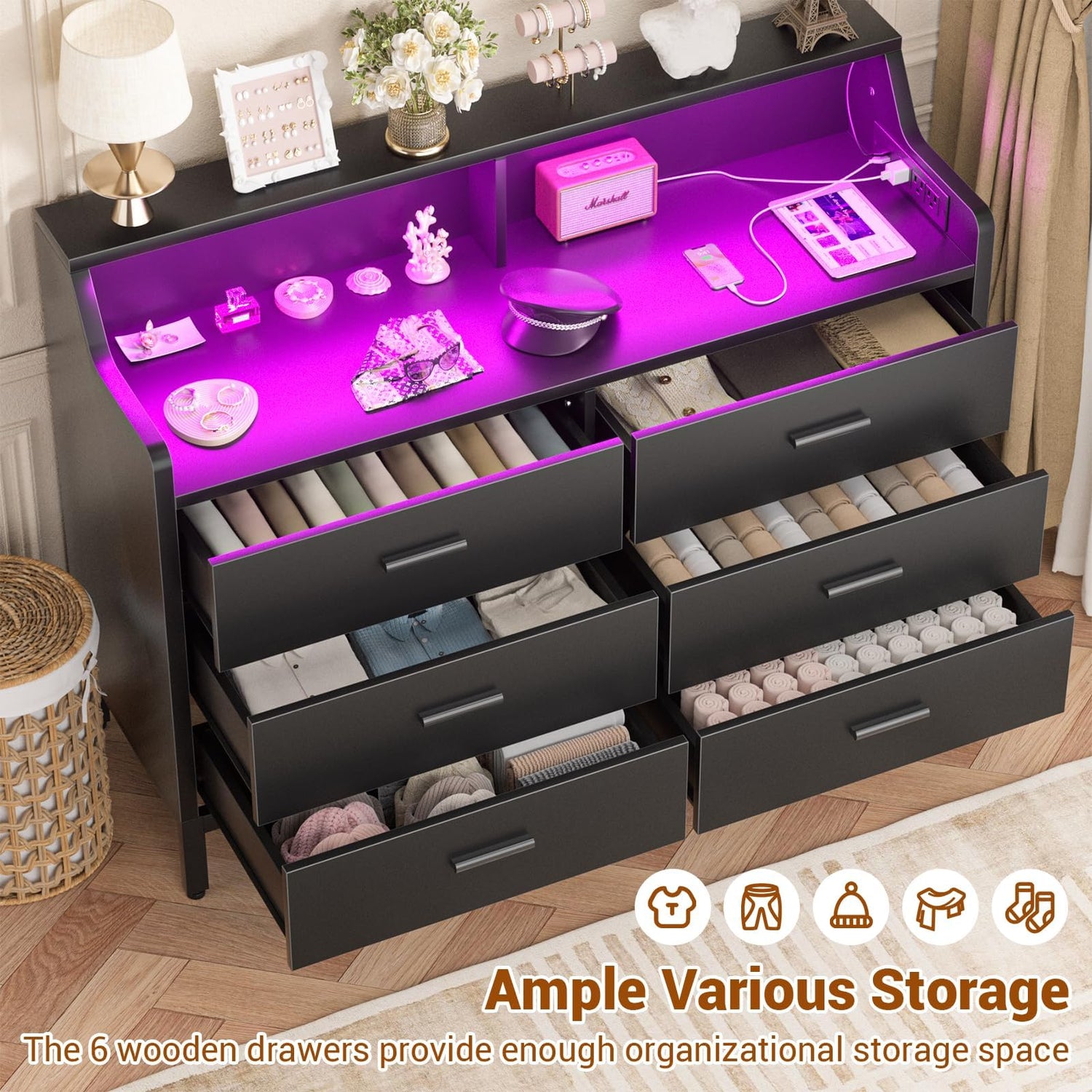 Hyomdeck 6 Drawer Dresser for Bedroom, Wooden Chest of Drawers with Power Outlets and Smart LED Light, Sturdy Modern Bedroom Furniture, Wide Storage Dresser for Living Room, Closet, Entryway, Black