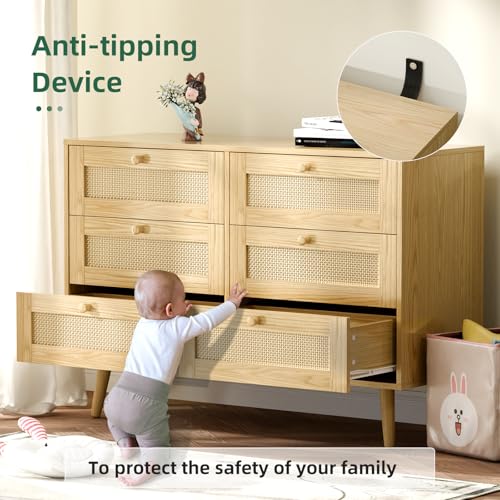 Details: 6 Drawer Rattan Dresser for Bedroom, Modern Wooden Dresser Chest with Handles for Bedroom, Hallway and Living Room, Wood Oak