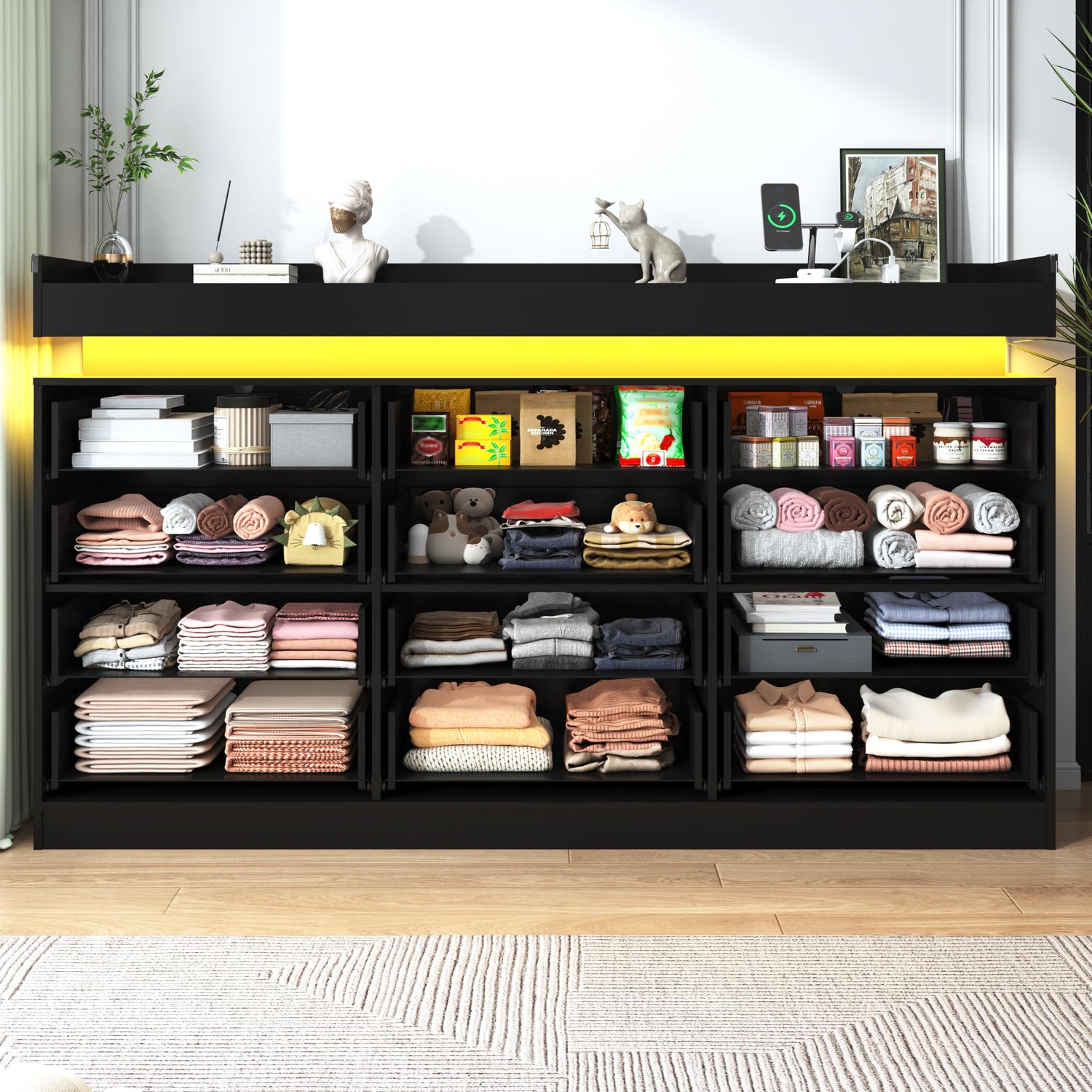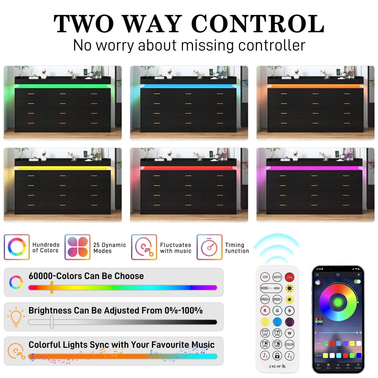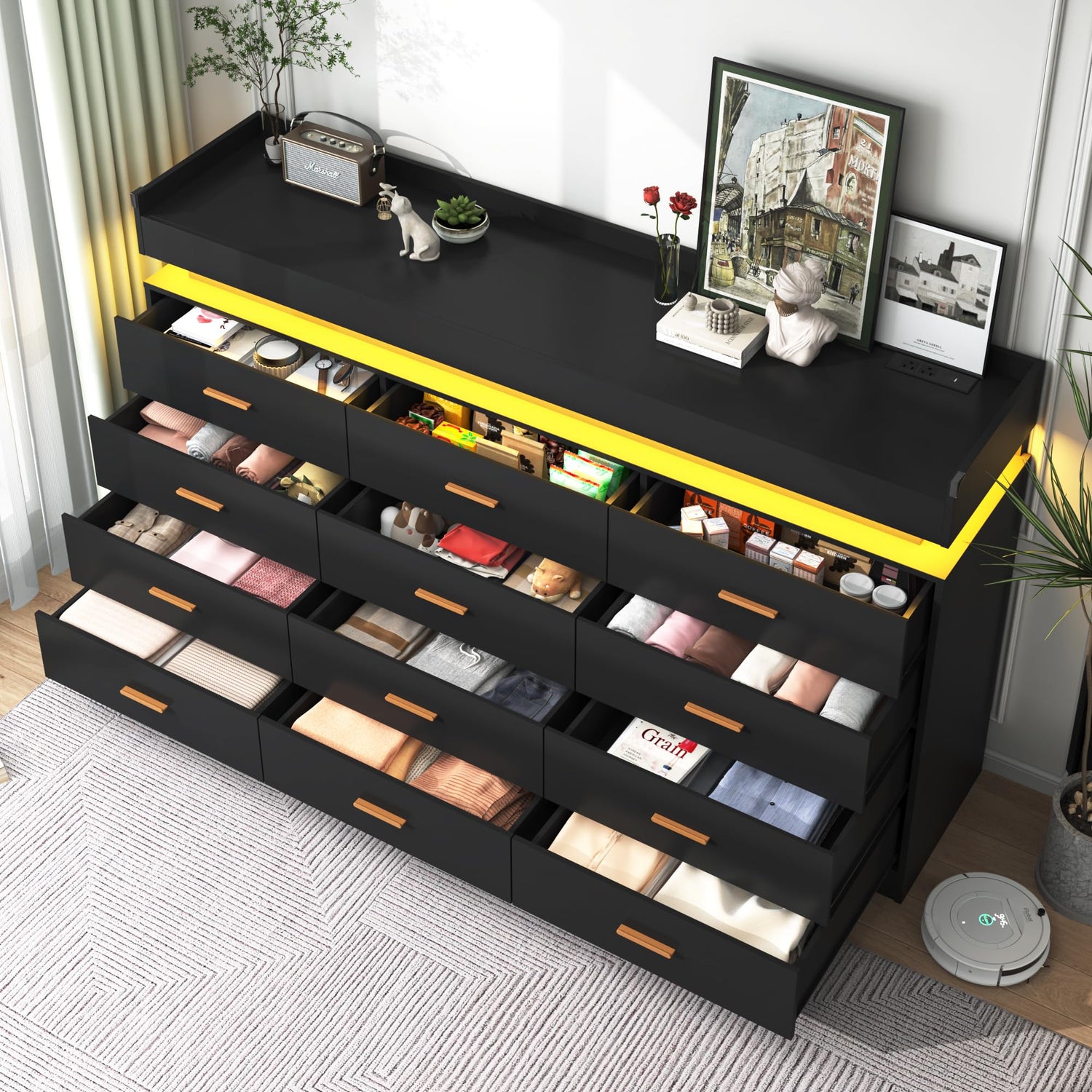 jiteentarou 12 Drawer Dresser with Charging Station and LED Lights, Modern Chest of Drawers with Power Outlet, Organizer Cabinet for Bedroom, Living Room, Entryway, Black