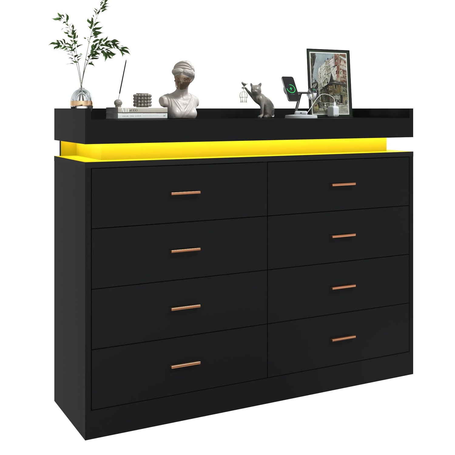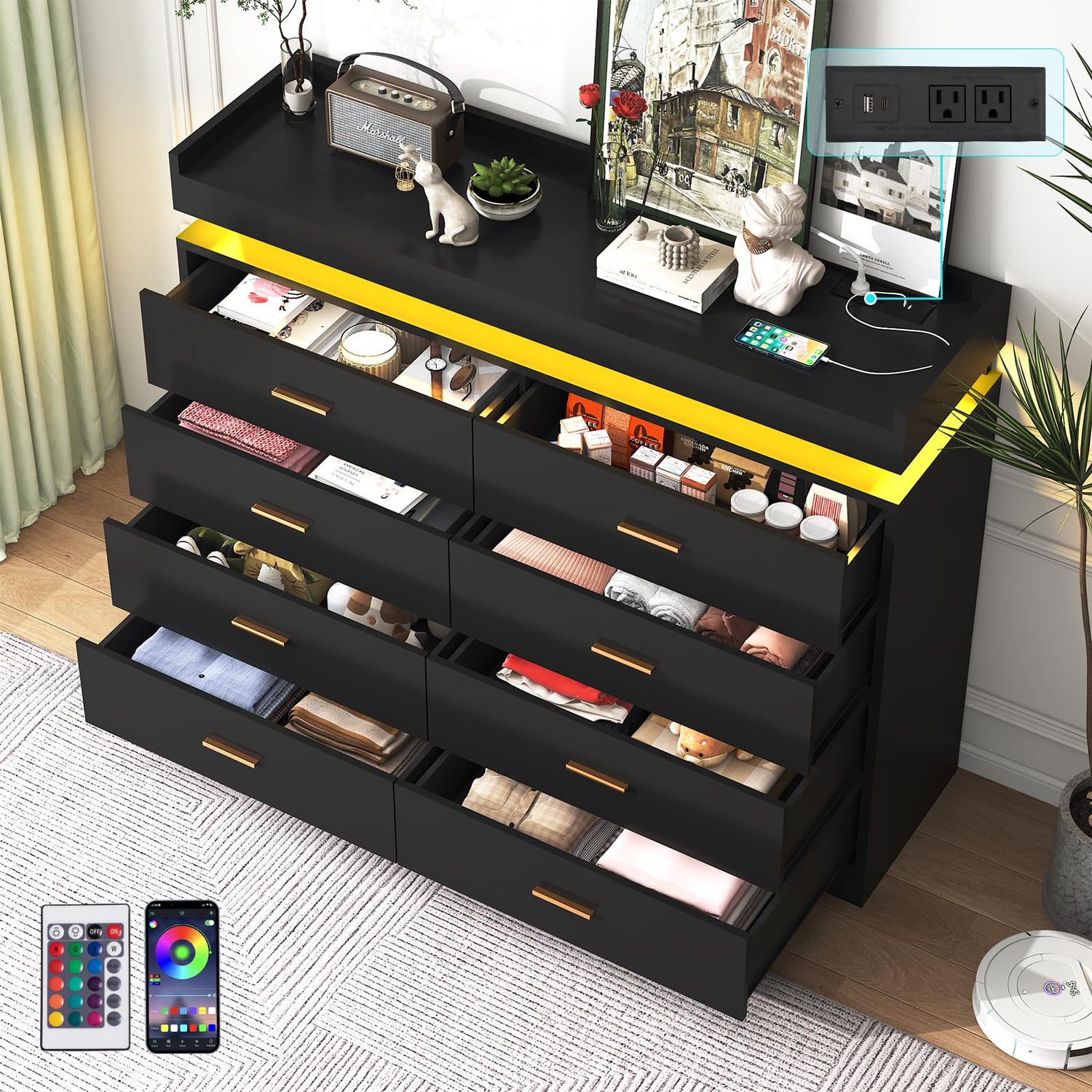 jiteentarou 8 Drawer Dresser with Charging Station and LED Lights, Modern Chest of Drawers with Power Outlet, Organizer Cabinet for Bedroom, Living Room, Black
