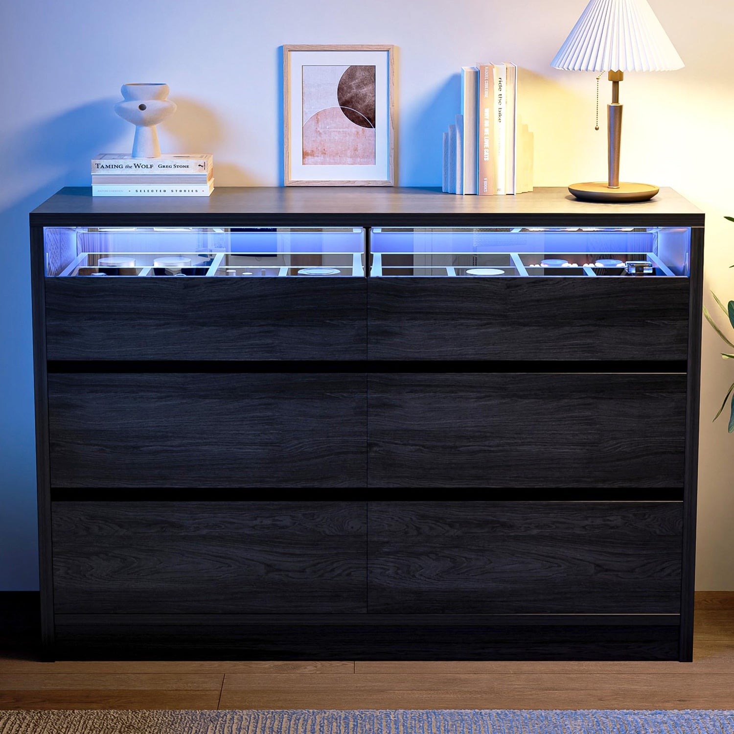Jocoevol Modern LED 6 Drawer Dresser for Bedroom, Large Chest of Drawers with Hidden Handles, Long Double Wooden Dresser Closet for Living Room, Entryway, Hallway (Black)