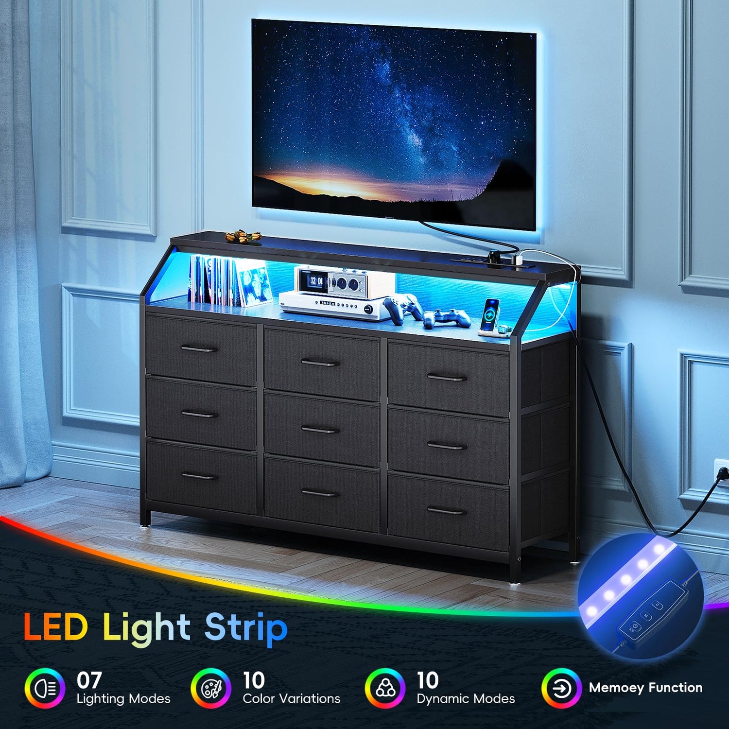 - 【Dresser with Colorful LED Lights】The dresser features RGB LED light strips. Choose from 10 static colors, 10 dynamic modes, and 7 brightness levels to create the cozy and pleasant ambiance. With memory function and easy-to-use controls, you can effortlessly set the mood, adding a warm and inviting glow to your room.