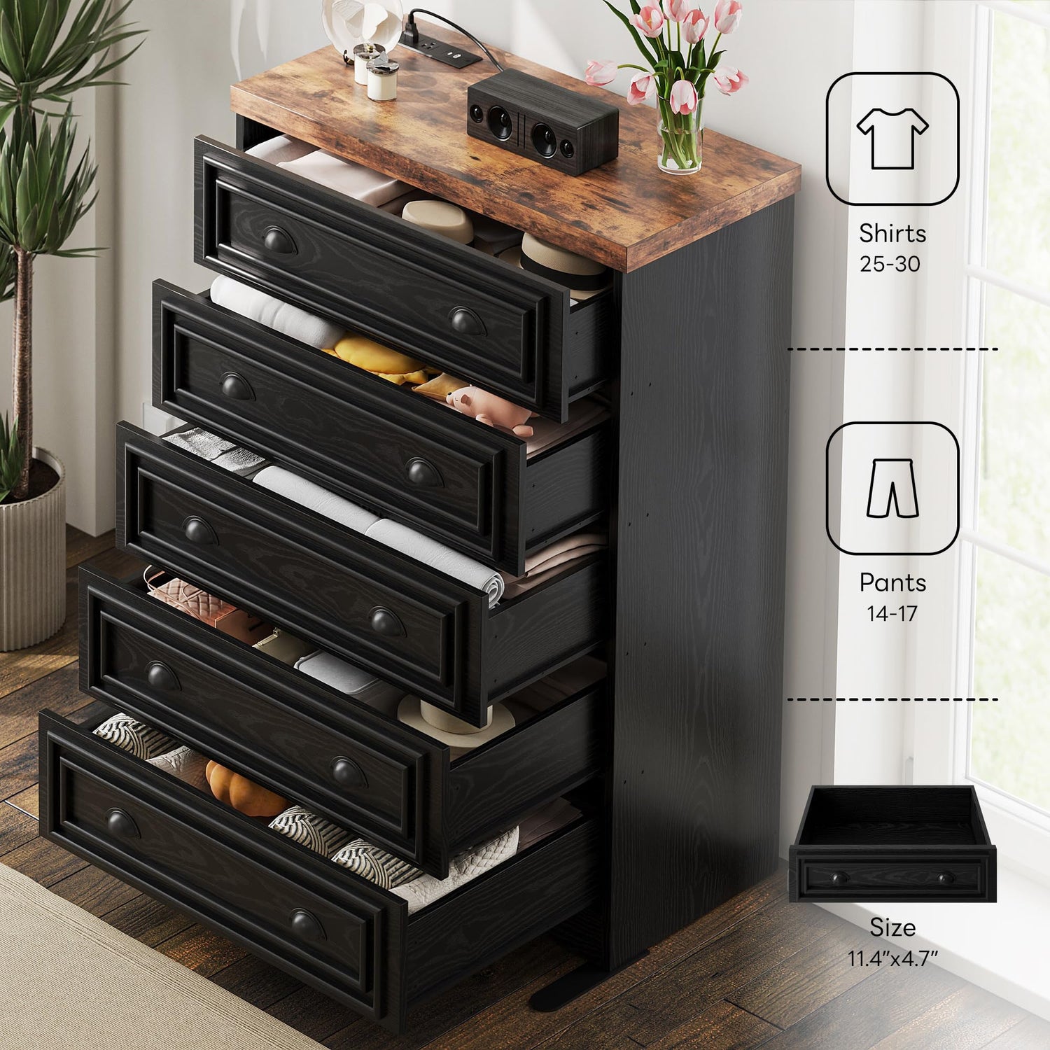 LIKIMIO 43" Tall 5 Drawers Dresser for Bedroom, Power Strip, Farmhouse Large Wood Dressers & Chest of Drawers with Wide Storage Cabinet, Black
