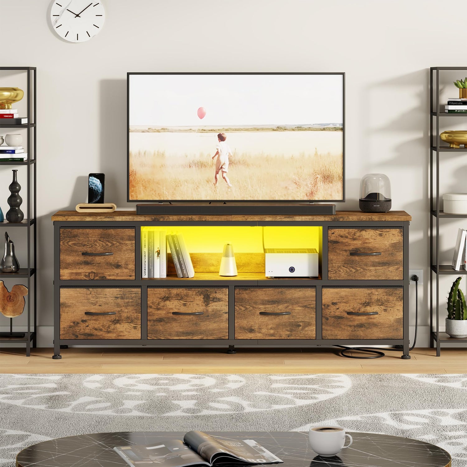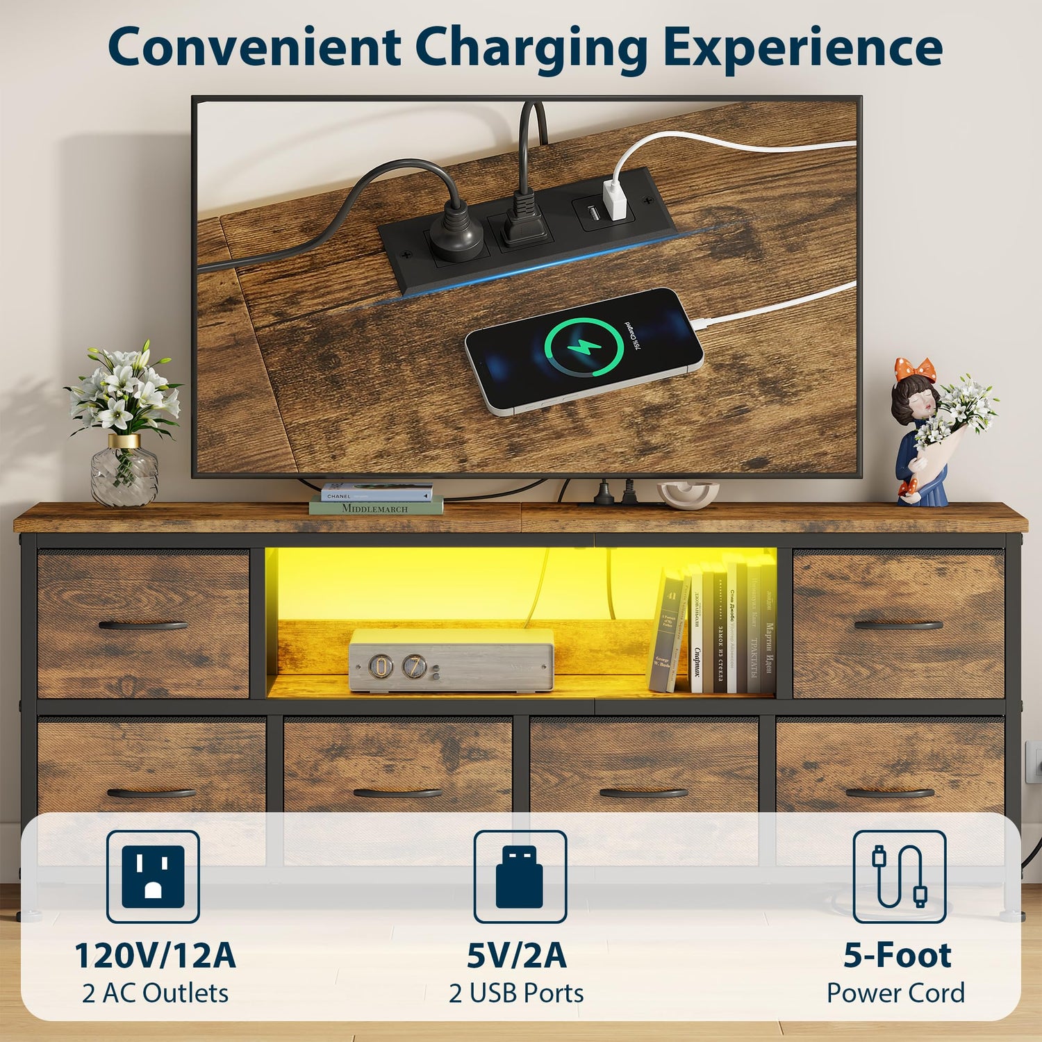 Lulive TV Stand for Bedroom, LED Rustic Brown Dresser for Living Room with 6 Fabric Drawers, 43 55in TV Stand with Power Outlet, Entertainment Center with Open Shelf