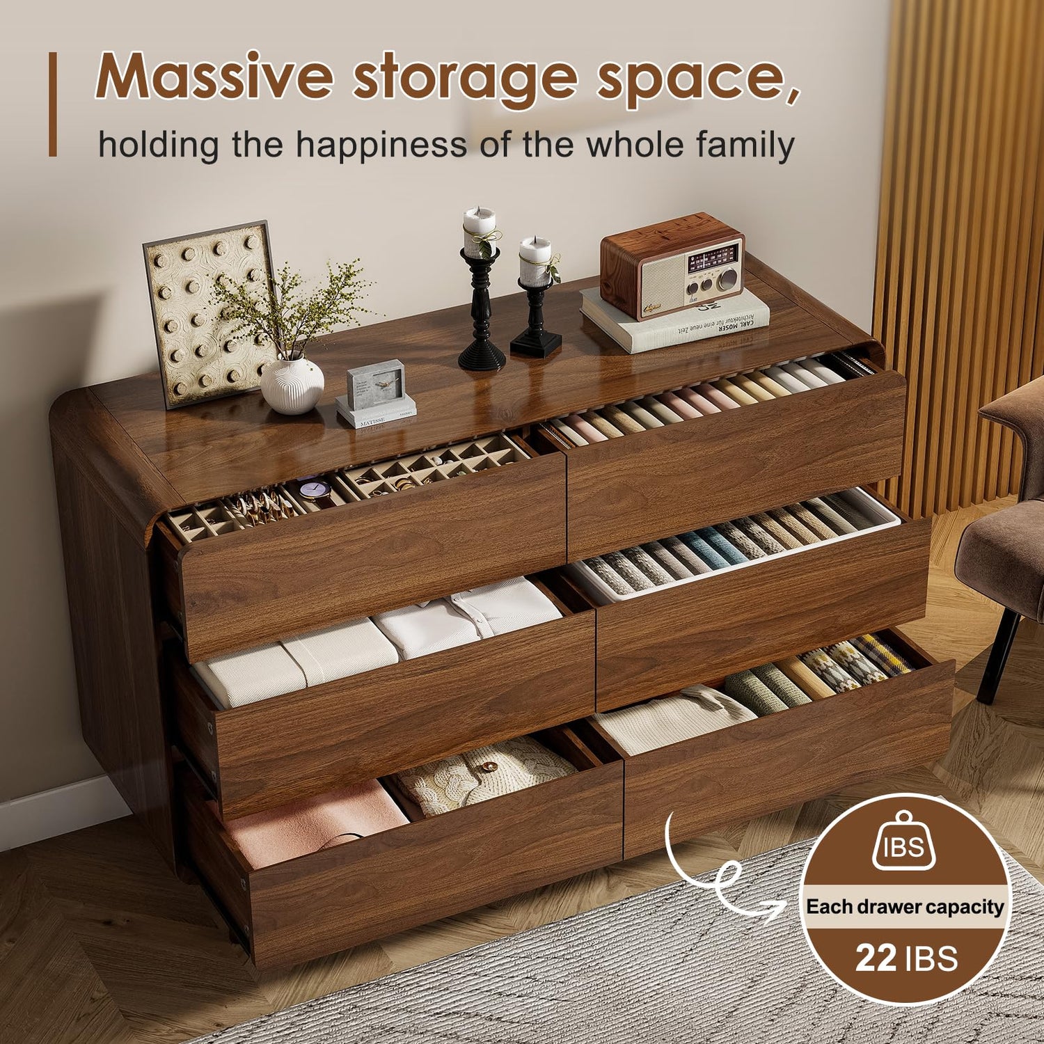 - Dimensions & Storage: The wooden dresser measures 47.2" W x 15.8" D x 30.7" H. The bedroom dresser comes with 6 spacious drawers. On the ample tabletop of the wood dresser, you can display photo, art , lamps, plants, antique clock etc. The drawers provide enough storage space for clothes, blankets, bedding, pillows, and diaper, avoiding from clutter and keeping your space neat and tidy.