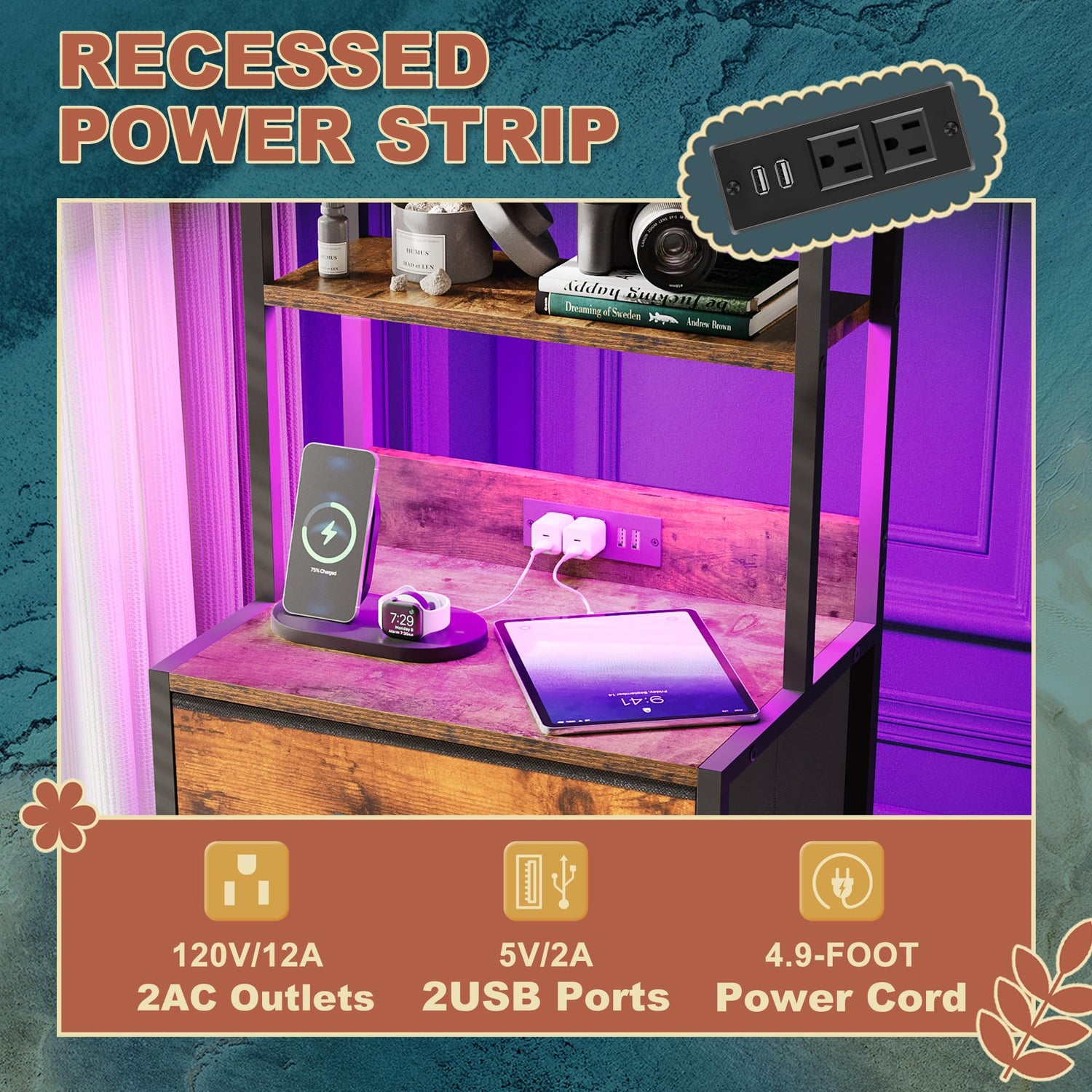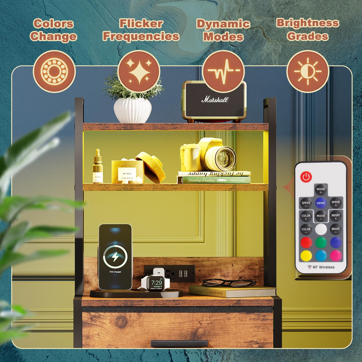 Nightstand 4 Drawer Dresser with LED Lights, Charging Station, Vertical Side Table with Fabric Drawers, End Table with 3 Open Shelves, Tall Dresser for Bedroom, Hallway, Entryway, Rustic Brown