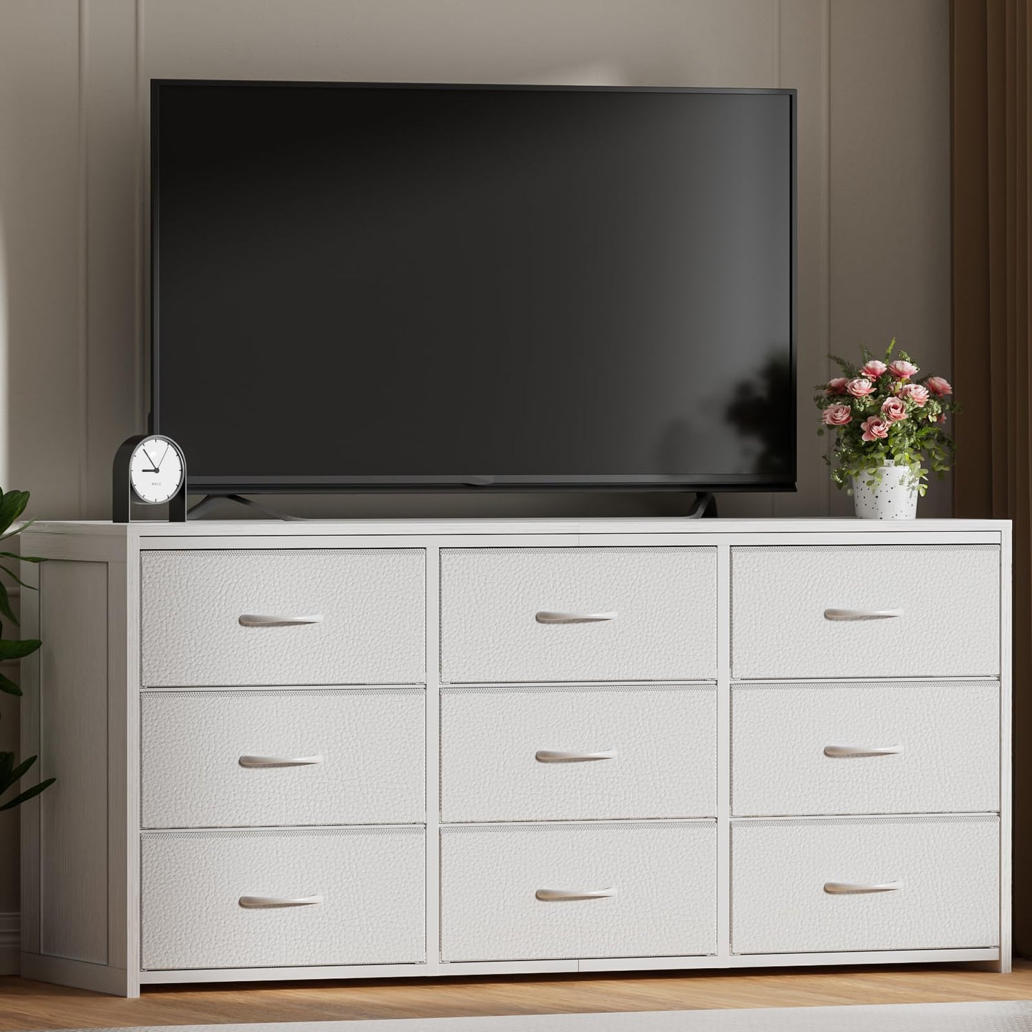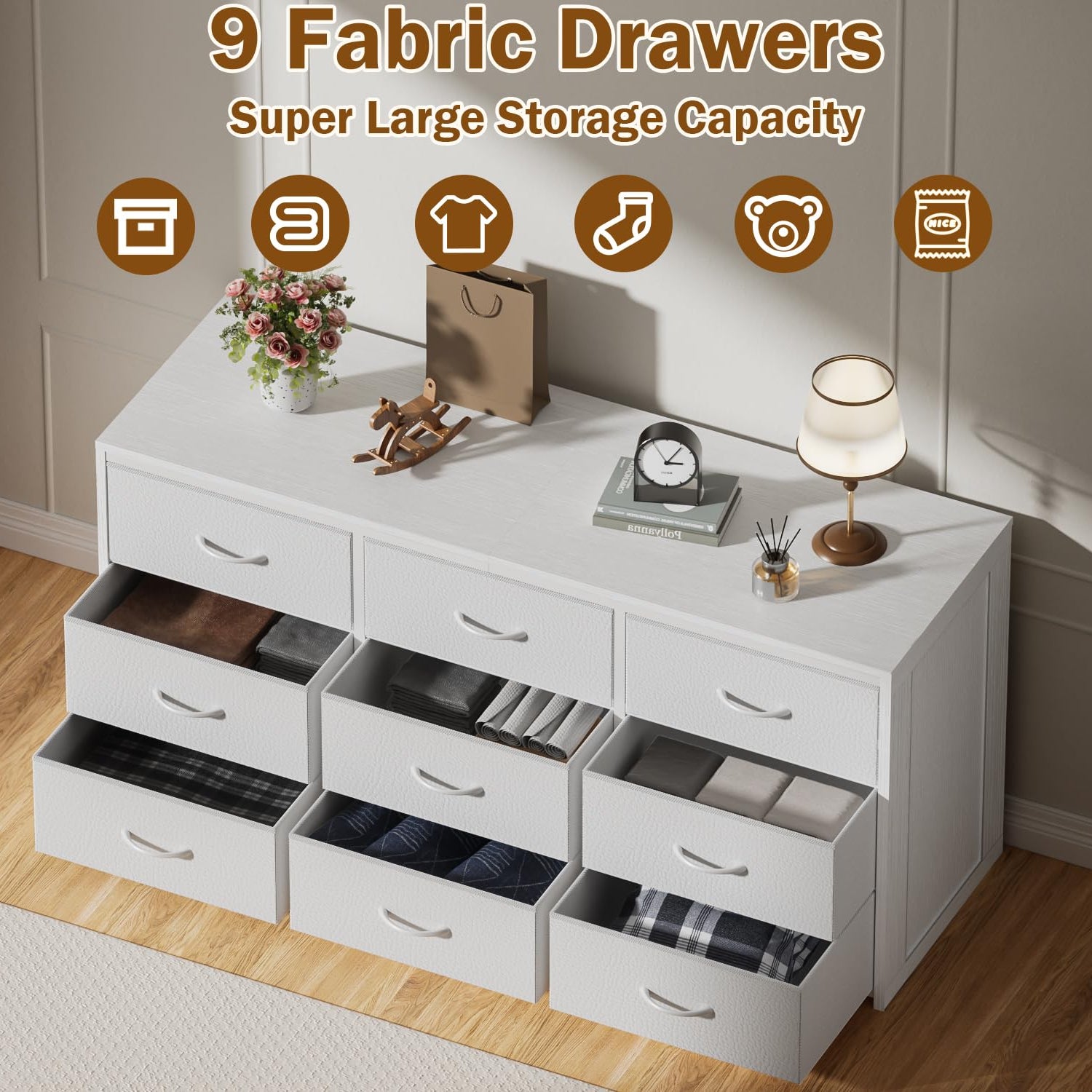 OURPIC Dresser for Bedroom with 9 Drawers, 55 Inch White Dresser TV Stand for 55, 60, 65 Inch TV, Wood Top and Side, Fabric Drawers, Storage, Dressers for Closet, Living Room, Hallway, Entryway