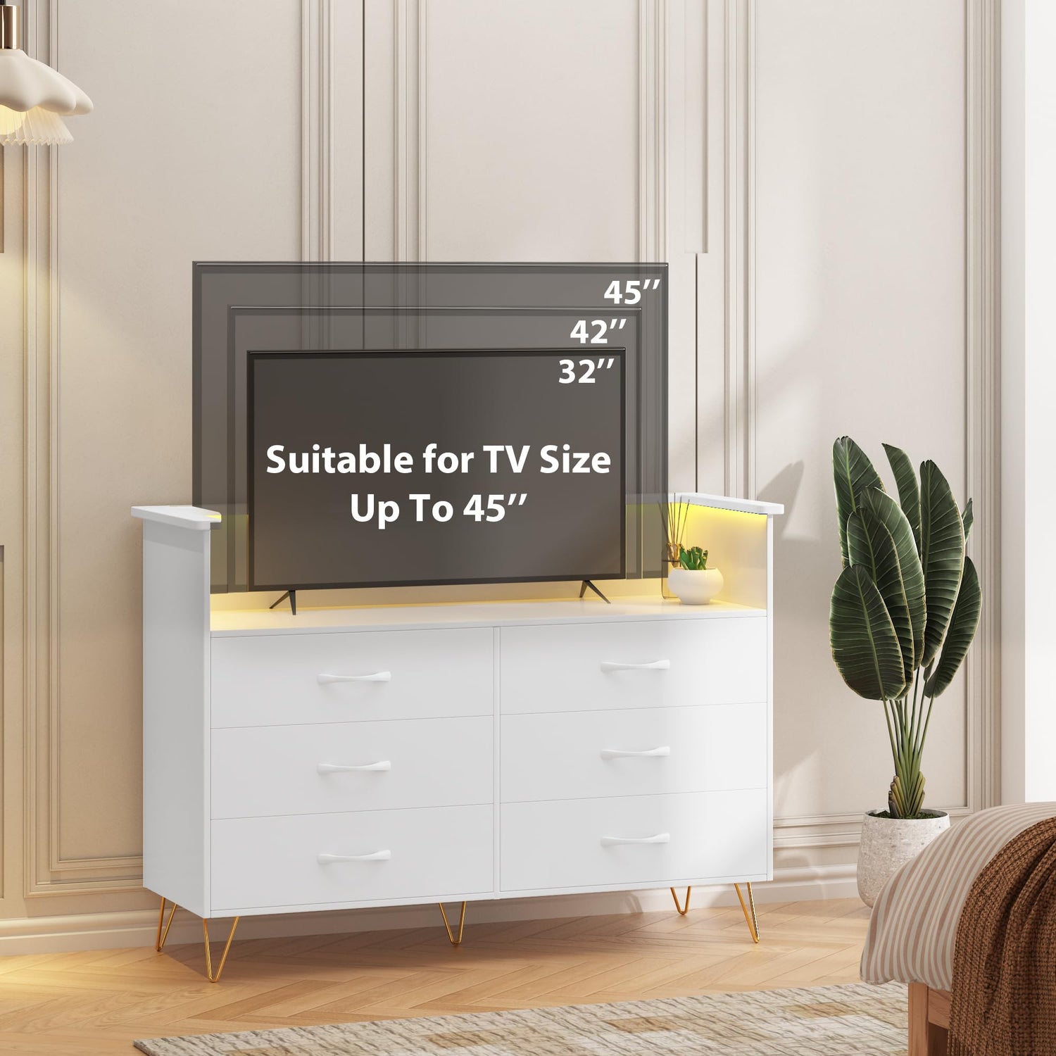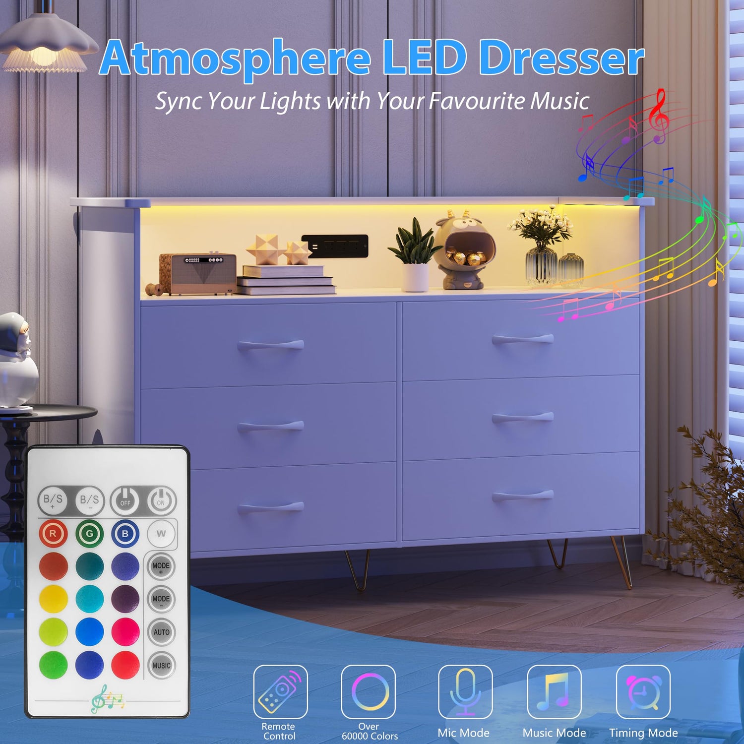 Patikuin White Dresser for Bedroom with LED Light & Charging Station, 6 Drawers Wooden Dressers with Open Space, Modern Chest of Double Wide Drawers for Living Room, Entryway, Hallway TV Stand