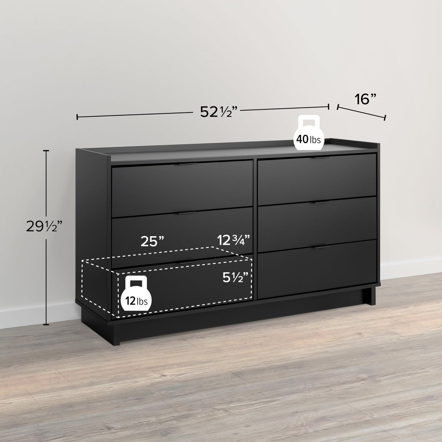 - STYLISH DRESSER FOR BEDROOM WITH A CLEAN, MODERN DESIGN- Space saving, side by side design features 6 total drawers with a sturdy top that holds up to 40 pounds, all in a pure black finish