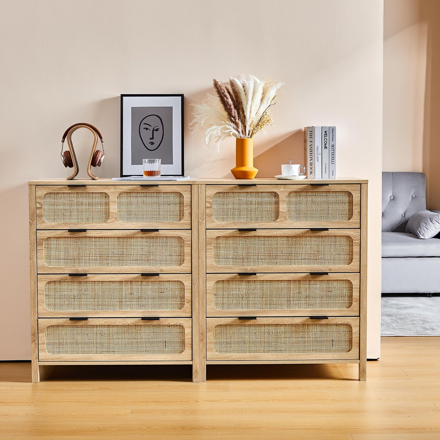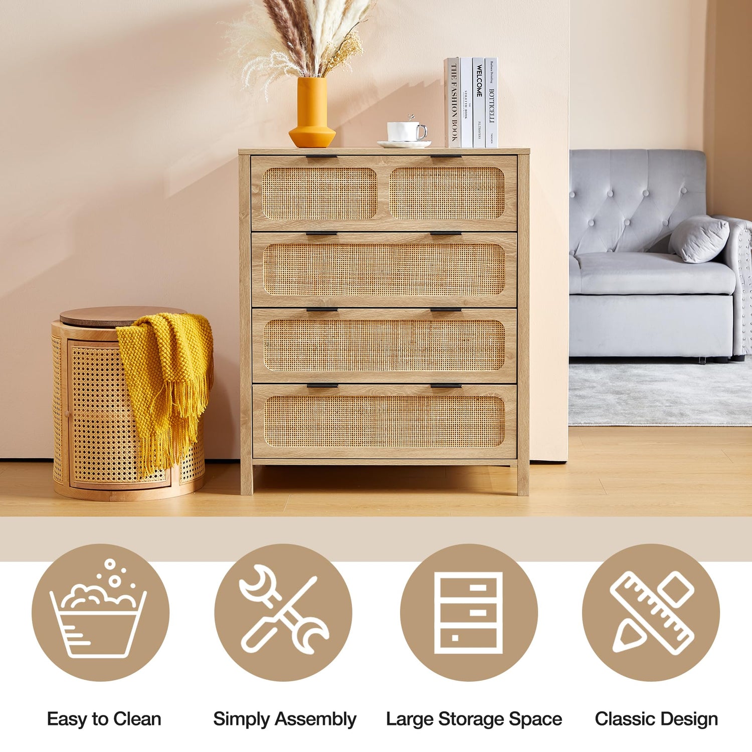 QEIUZON 4 Drawer Dresser, Modern Rattan Dresser Chest with Wide Drawers and Metal Handles, Farmhouse Wood Storage Chest of Drawers for Bedroom, Living Room, Hallway, Entryway (Natural-2 Packs)