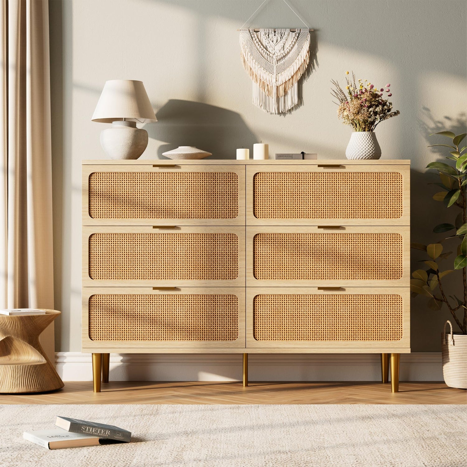Rattan 6 Drawer Dresser for Bedroom, Large Double Dresser with Deep Drawers, Chest of Drawers for Closet with Wide Top, Long Wooden Dresser for Living Room, Hallway, Kids Room, Natural
