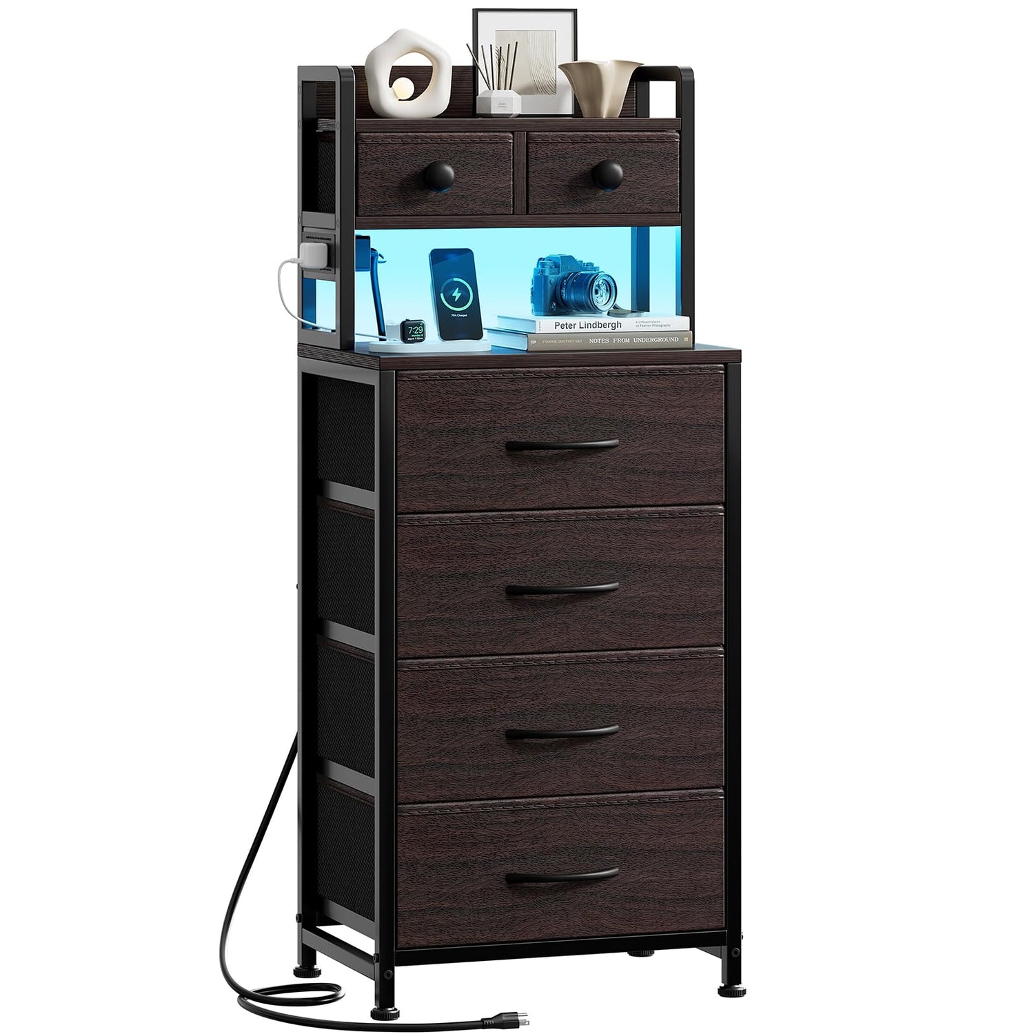 REAHOME 41 Inch Tall Nightstand with Charging Station, LED Night Stand with 6 Fabric Drawers, Bed Side Table with 3-Tier Wood Storage Shelves for Bedroom, Office, Small Spaces, Leather Brown