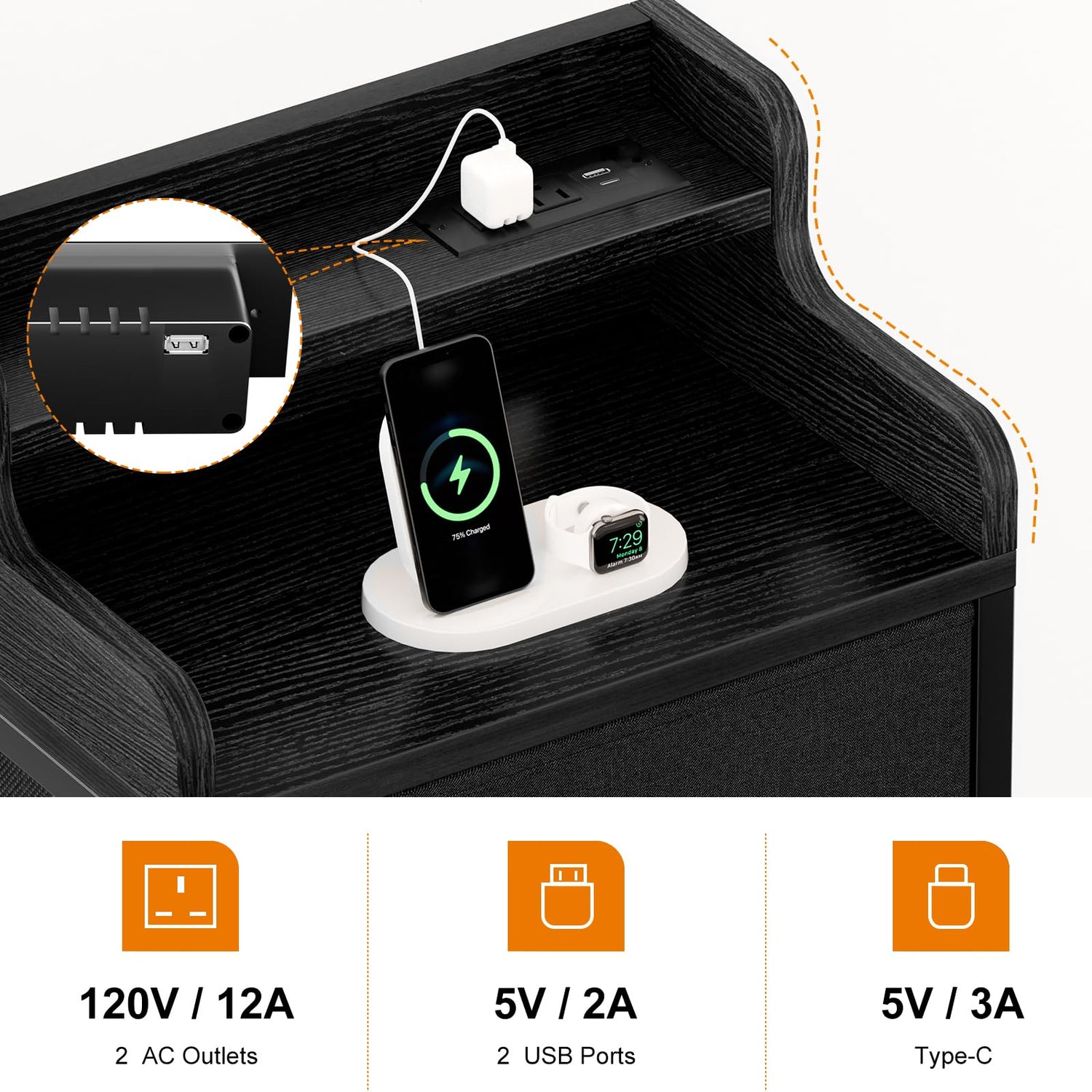 - Black Grey Dresser with Lights and Power Outlet: Charging station is equipped with 2 standard plug sockets, 2 USB ports and a 4.9 foot power cord. Upgrade: The light strip no longer occupies the socket hole, there are separate USB ports below! Very convenient