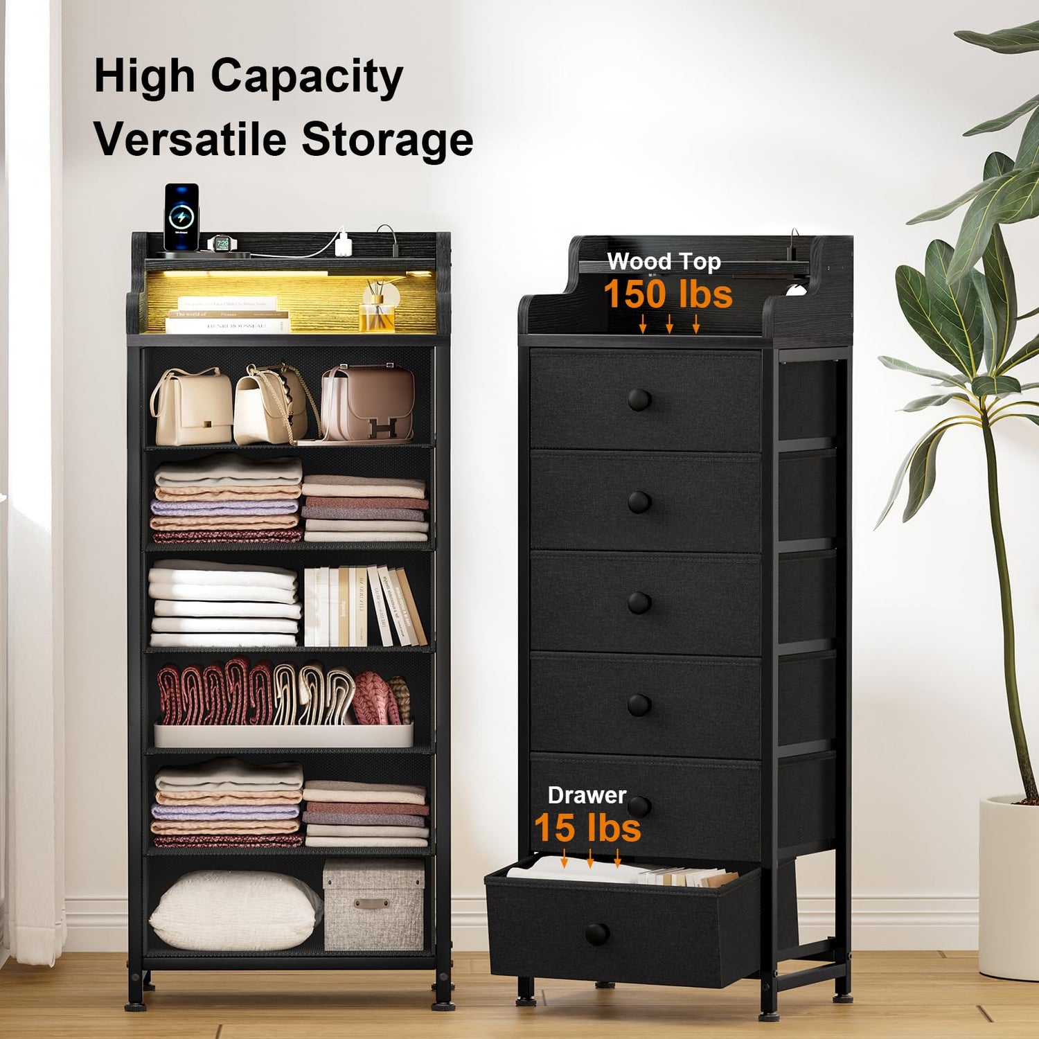 REAHOME Dresser for Bedroom with Charging Station and LED Lights, 6 Drawers Dresser Black Chest of Drawers with Shelves, Tall Night Stand with Sturdy Steel Frame & Wood Top for Bedroom - Black Grey