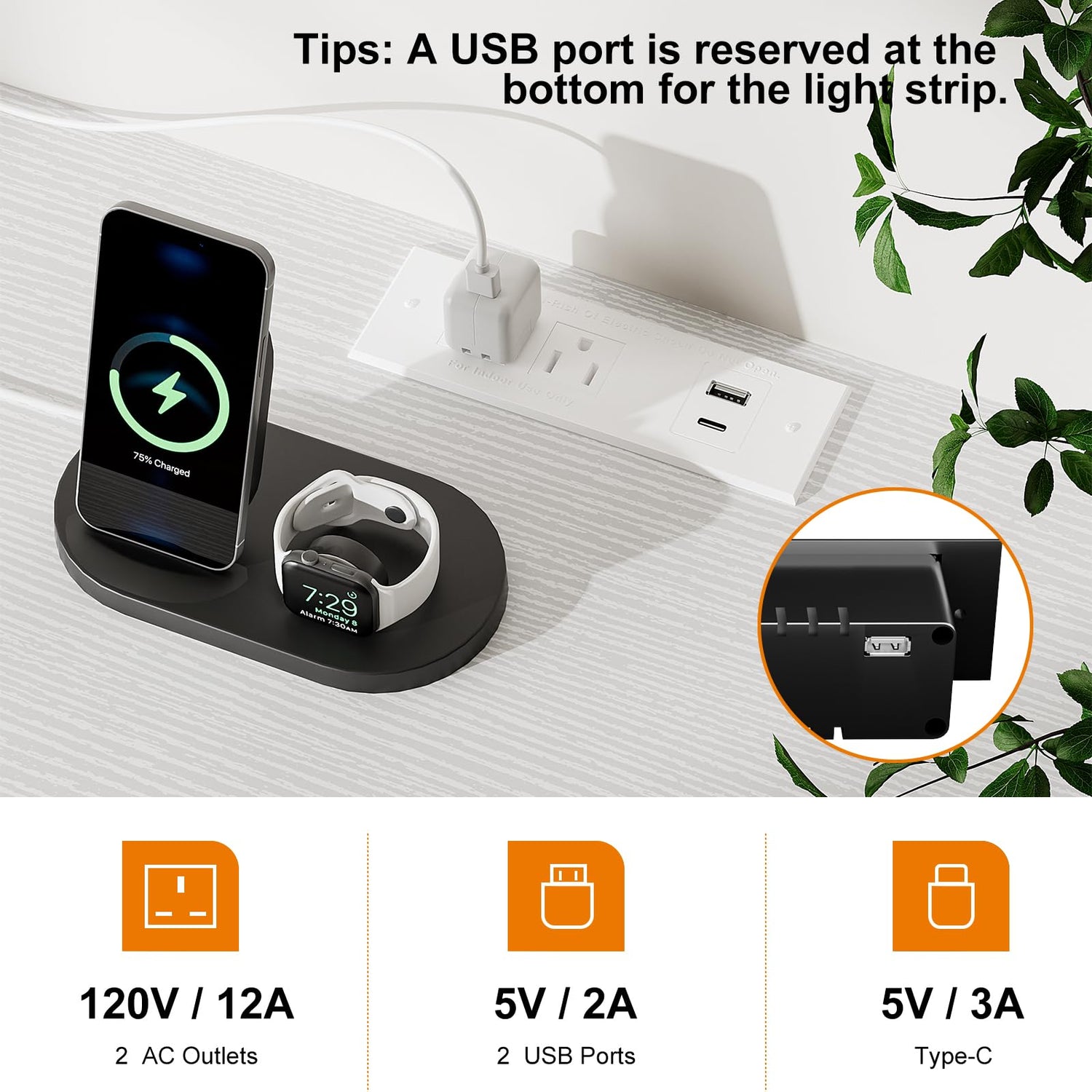 - 55” Dresser TV Stand with Charging Station: The charging station is equipped with 2 standard plug sockets, 2 USB ports, 1 Type-C and a 4.9-foot power cord. Multiple devices such as mobile phones, headphones, watches, computers, etc. can be charged at the same time