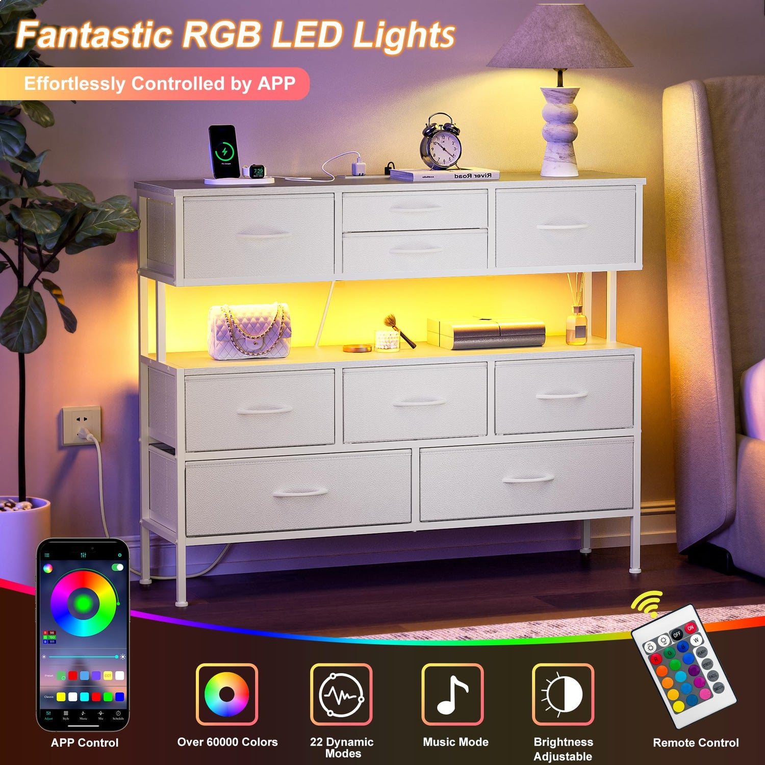 - Dresser for Bedroom with LED Lights: Dresser is equipped with an intelligent 20 color LED light system, which allows you to control 21 dynamic modes, 8 speed modes, and 8 brightness modes. follow your mood meet your needs. Additional design: A USB port is reserved at the bottom for the light strip