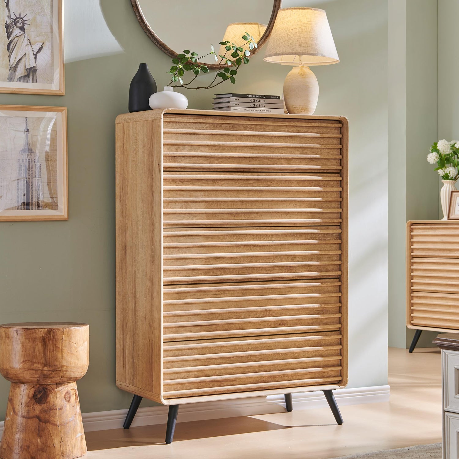 - Unquie Slatted Panel Desigh: The distinctive slatted panel and smooth curved contour design, paired with the wood grain texture of the tabletop, create a unique and elegant aesthetic for the wooden dresser. The mid-century modern design gives the white dresser a more modern feel. The rounded corners soften the look of the streamlined frame while providing a safe environment for your family