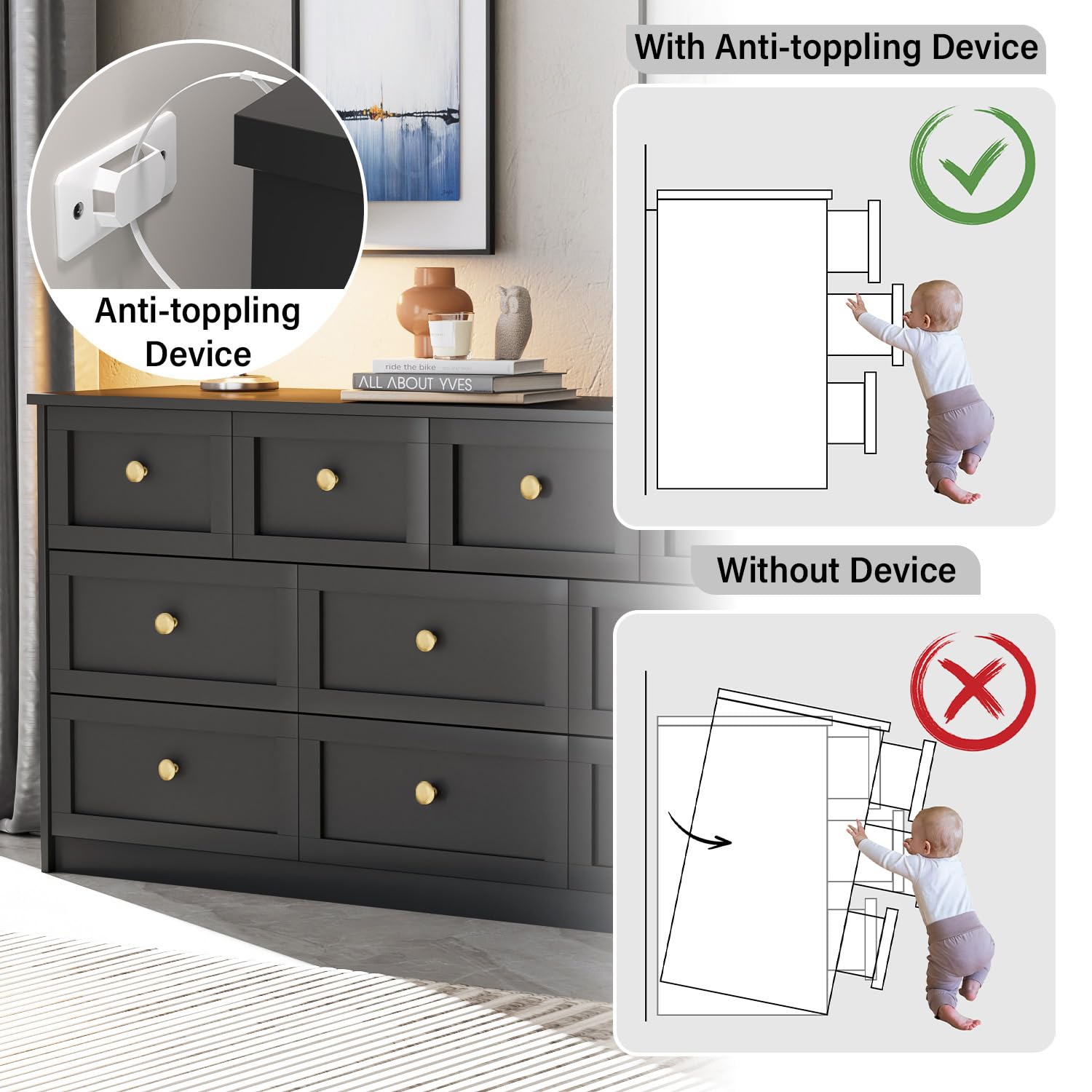 • Robust and Stable: Crafted from high-quality wood, this sturdy and stable black storage chest of drawers has solid wood table legs for added durability. The anti-tilt device ensures the safety of your loved ones