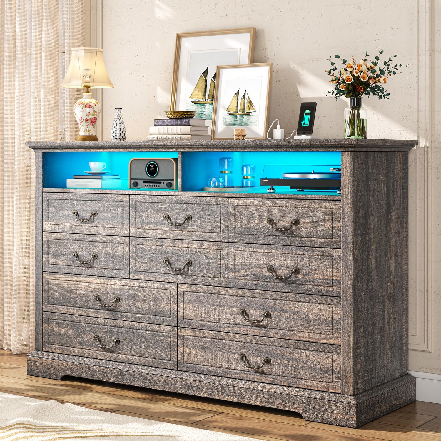• Functional Dresser for Daily Use: Grey dresser feature built-in LED strips can not only set the mood, also make finding items easily even in a dark room. You can choose from 7 option colors to match your vibe. Plus, this large dresser has a power station, complete with 2 outlets and 2 Type-A ports, making it convenient for you to charge anytime.