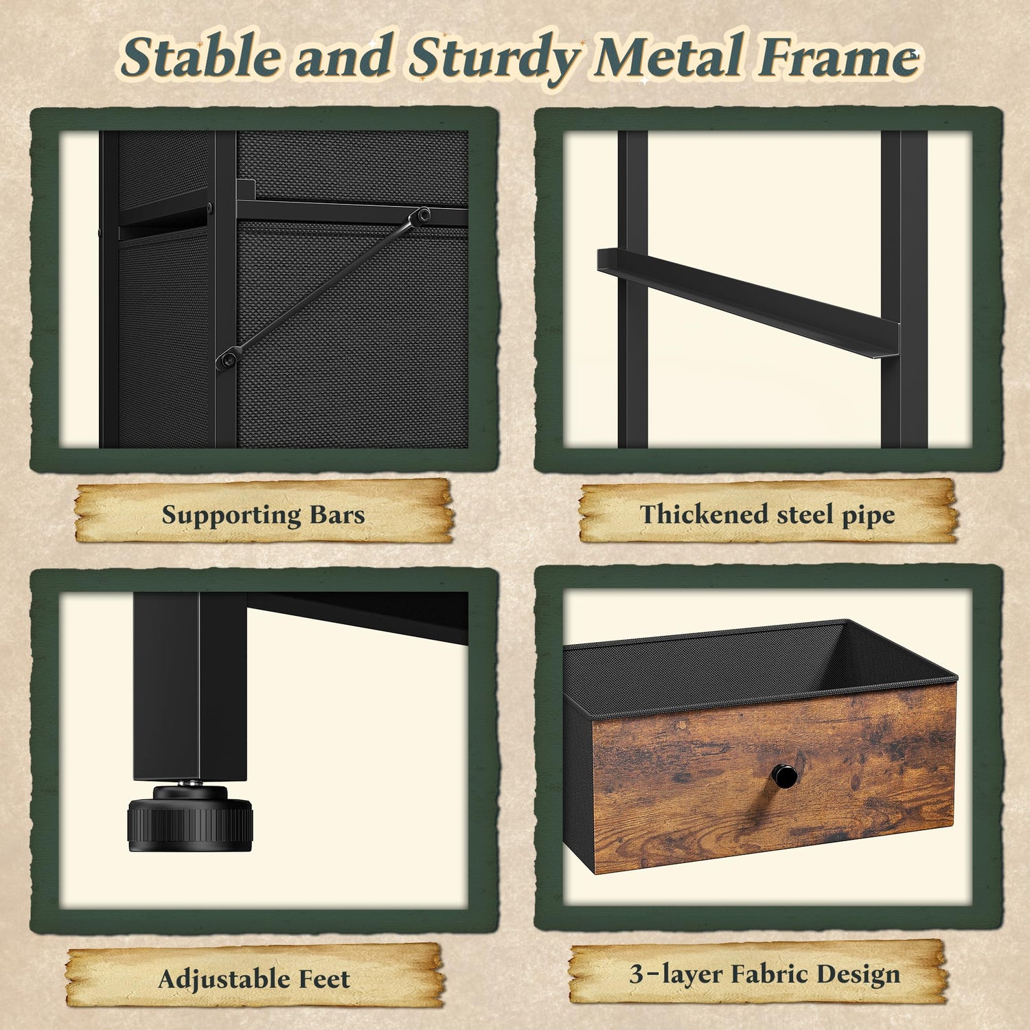 - Sturdy, Safe and Stable: Sturdy steel frame offers stable support and ensures years of use, Equipped with anti-tip kits to prevent the dresser with 12 drawers from tipping over. Adjustable feet can prevent wobbling on uneven floors and protect the floor from scratches and 4 reinforced parts on the back, the whole won't deform and collapse, and can be used longer than normal storage organiser