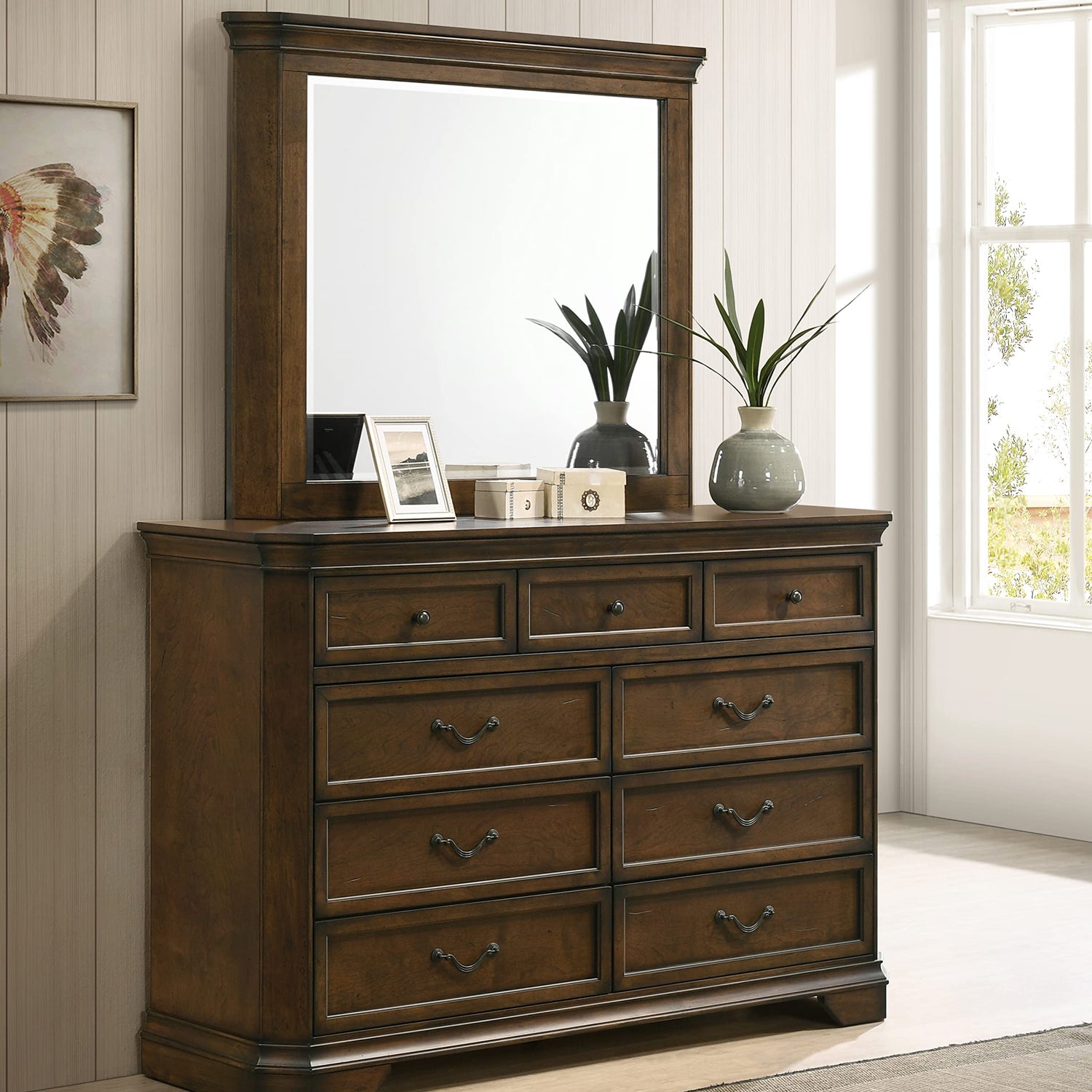 - 9-Drawer wood dresser with mirror finished in antique walnut with distressed marks