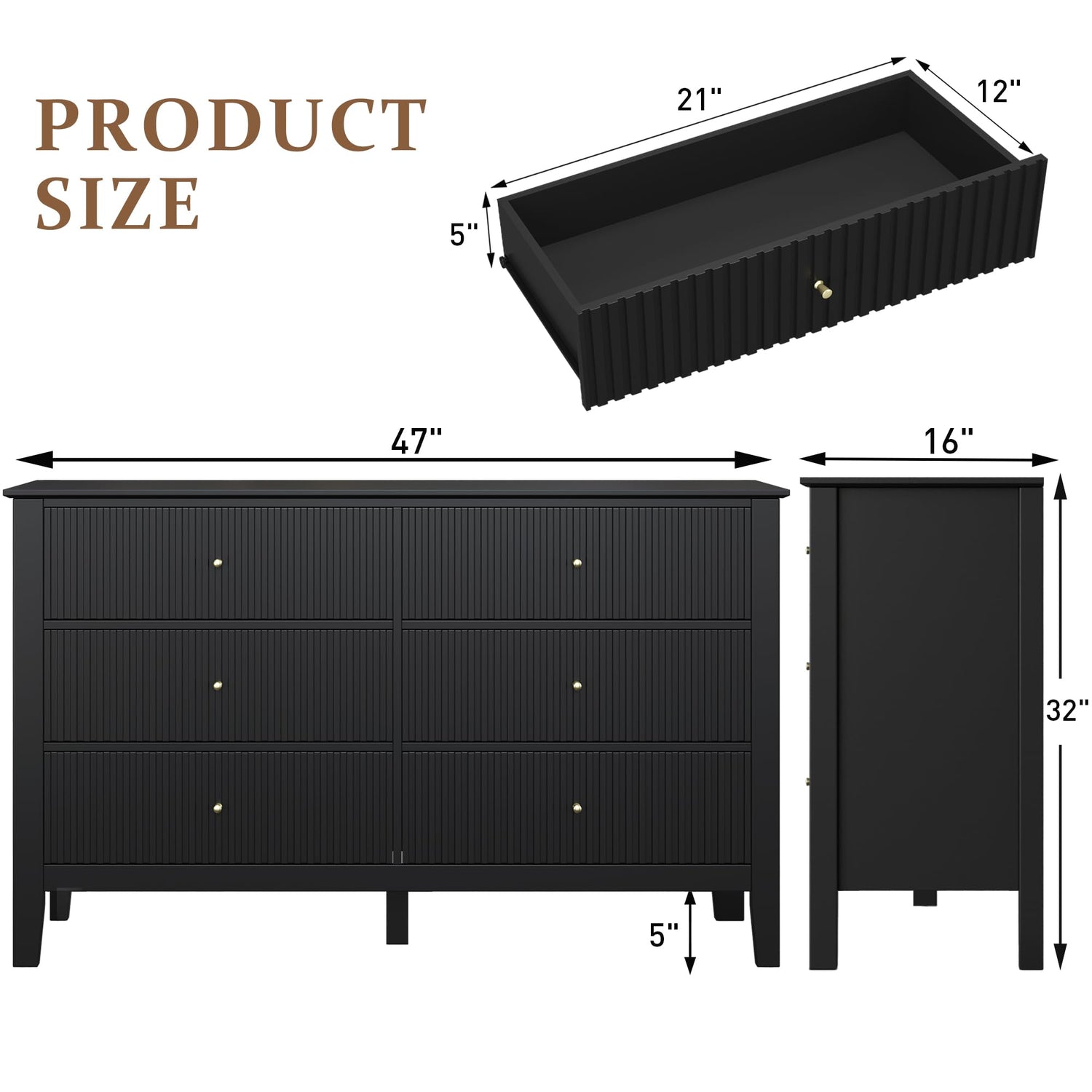 RoyalCraft Black 6 Drawer Dresser, Fluted Modern Wood Dresser, Double Chest of Drawers, Long Dresser for Bedroom TV Stand Storage Cabinet for Living Room