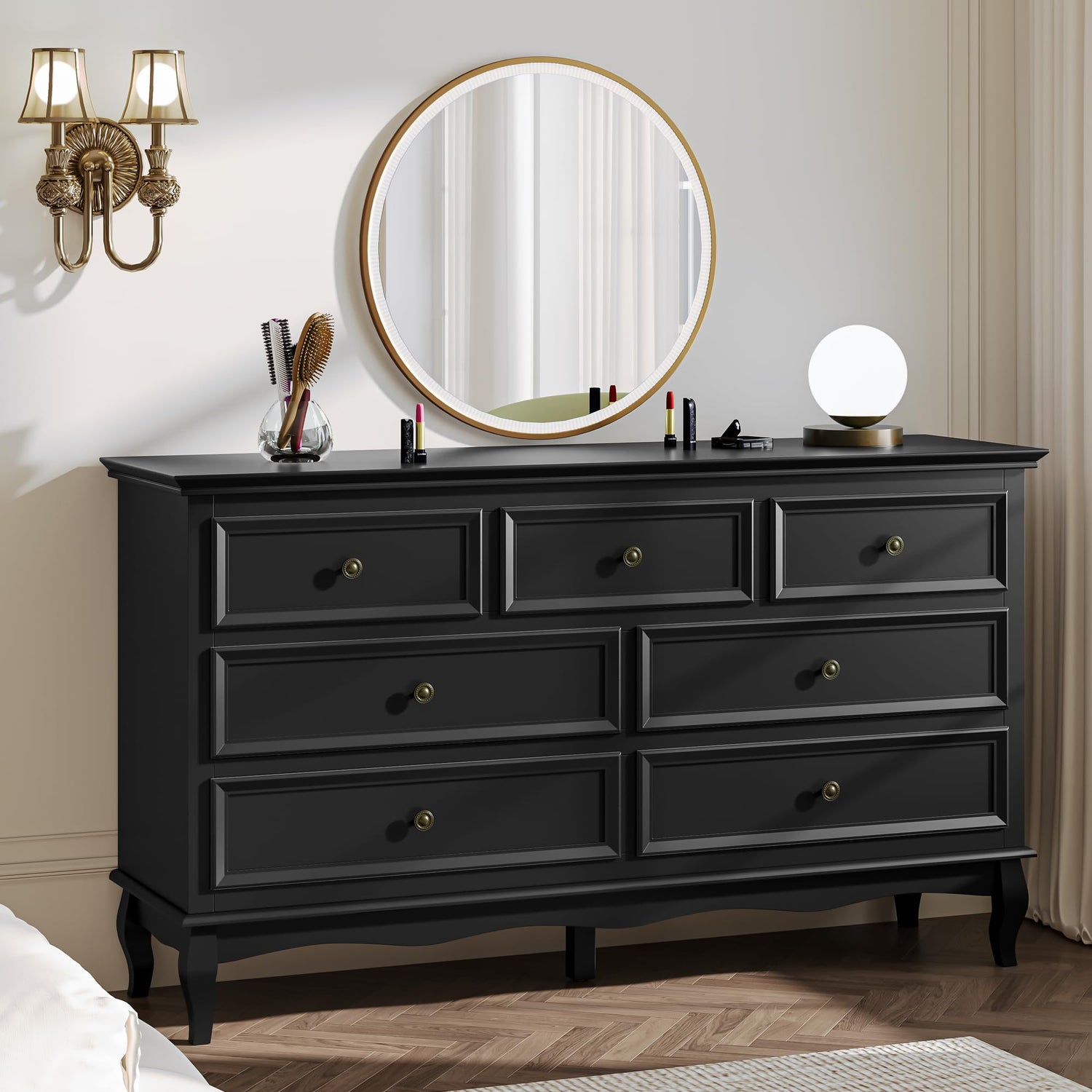 RoyalCraft Dresser for Bedroom, 7 Drawers Dresser with Distinctive Wooden Legs & Black Paint Finish, Black Drawer Dresser with Spacious Storage Space for Bedroom, Hallway