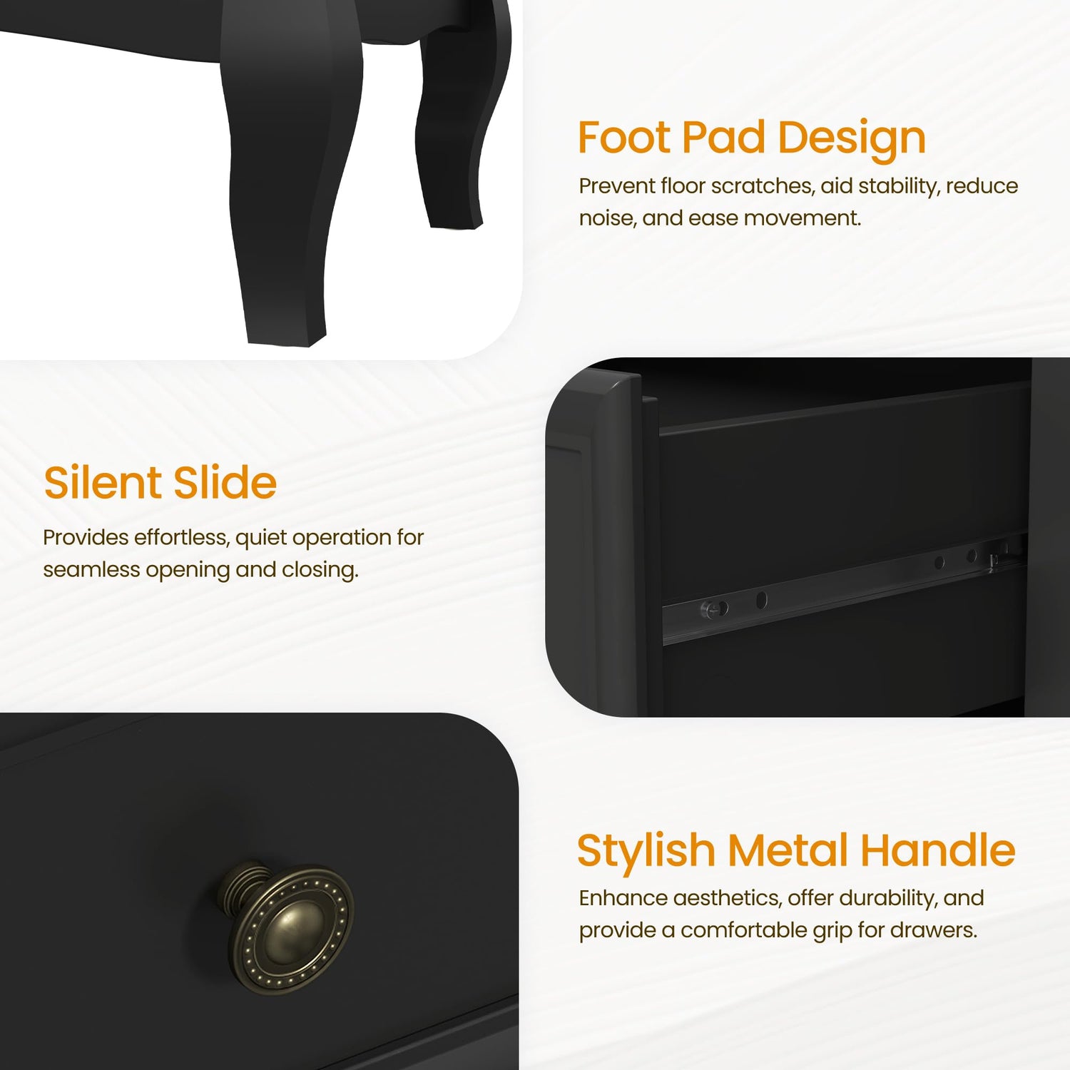- Modern Charm: Chic and modern, this wood dresser showcases a classic black finish, metal handles, a wavy bottom, and distinctively shaped wooden legs. It effortlessly enhances any decor, bringing a refined and elegant touch to your space.