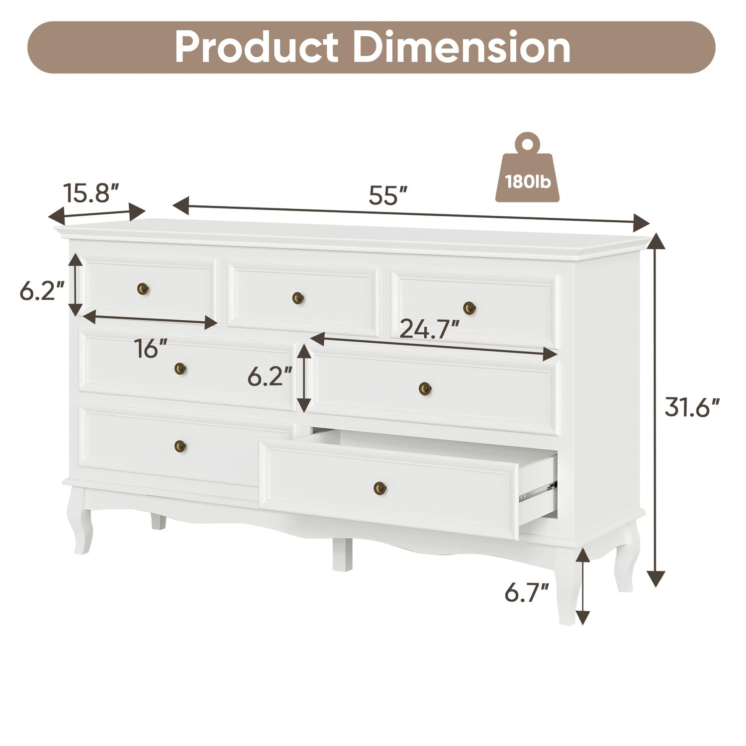 RoyalCraft White 7 Drawer Dresser for Bedroom, Modern Chest of Drawers with Solid Wood Legs and Painted Finish, Wooden Storage Closet Cabinet Organizer for Living Room, Hallway